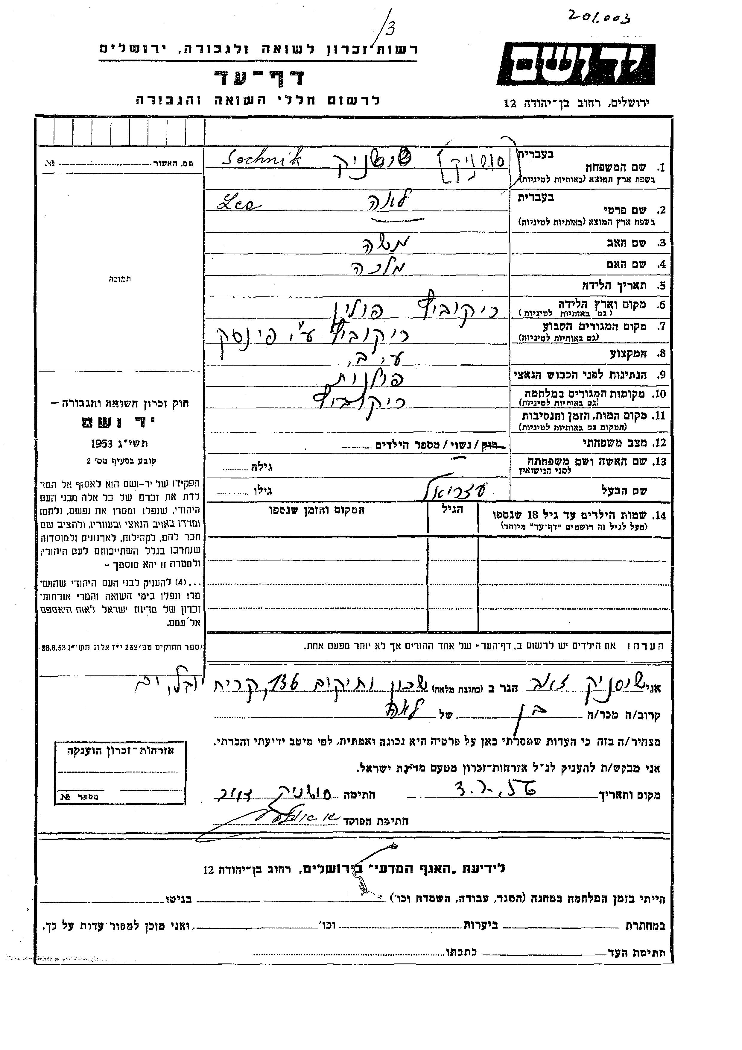 Lea Sochnik wurde in Raikovitz, Polen geboren. Sie war die Tochter von Moshe und Malka. Sie war Hausfrau und mit Azriel Verheiratet. Vor dem Zweiten Weltkrieg lebte sie in Raikovitz, Polen. Während des Krieges war sie in Raikovitz, Polen.