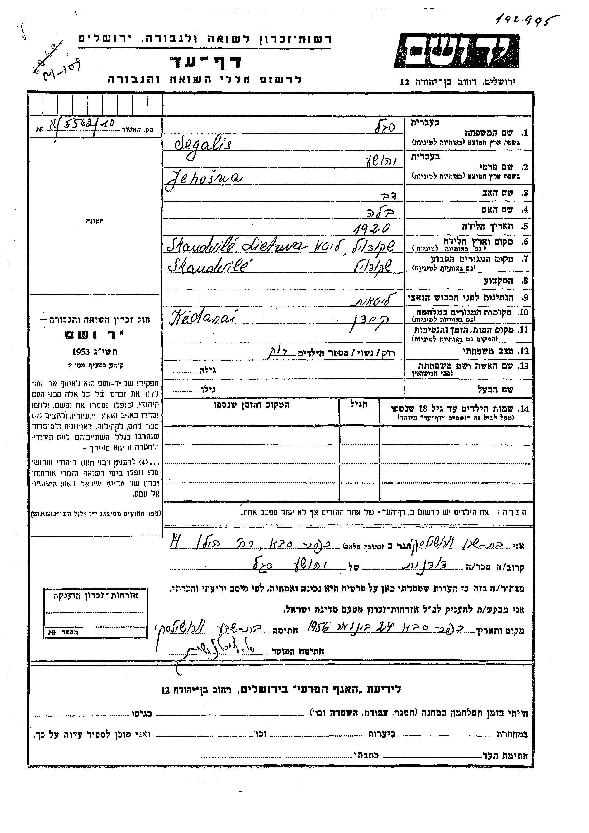 Jehosua Segalis wurde im Jahr 1920 in Skaudvile, Litauen geboren. Er war der Sohn von Dov und Bela. Er war Ledig. Vor dem Zweiten Weltkrieg lebte er in Skaudvile, Litauen. Während des Krieges war er in Keidani, Litauen.