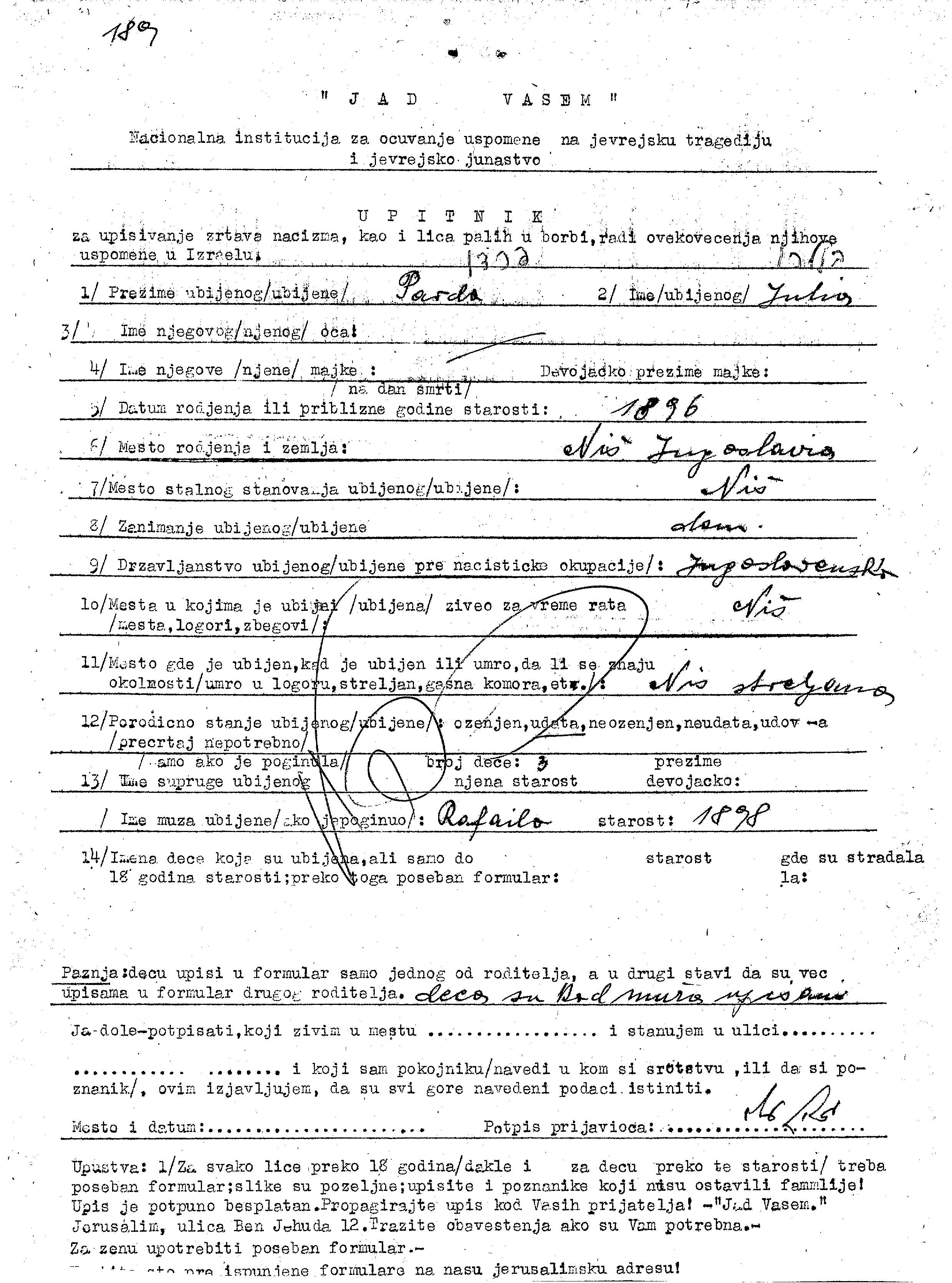Pardo | Julija | 1896 | Nis, Jugoslawien | Verfolgtenliste |