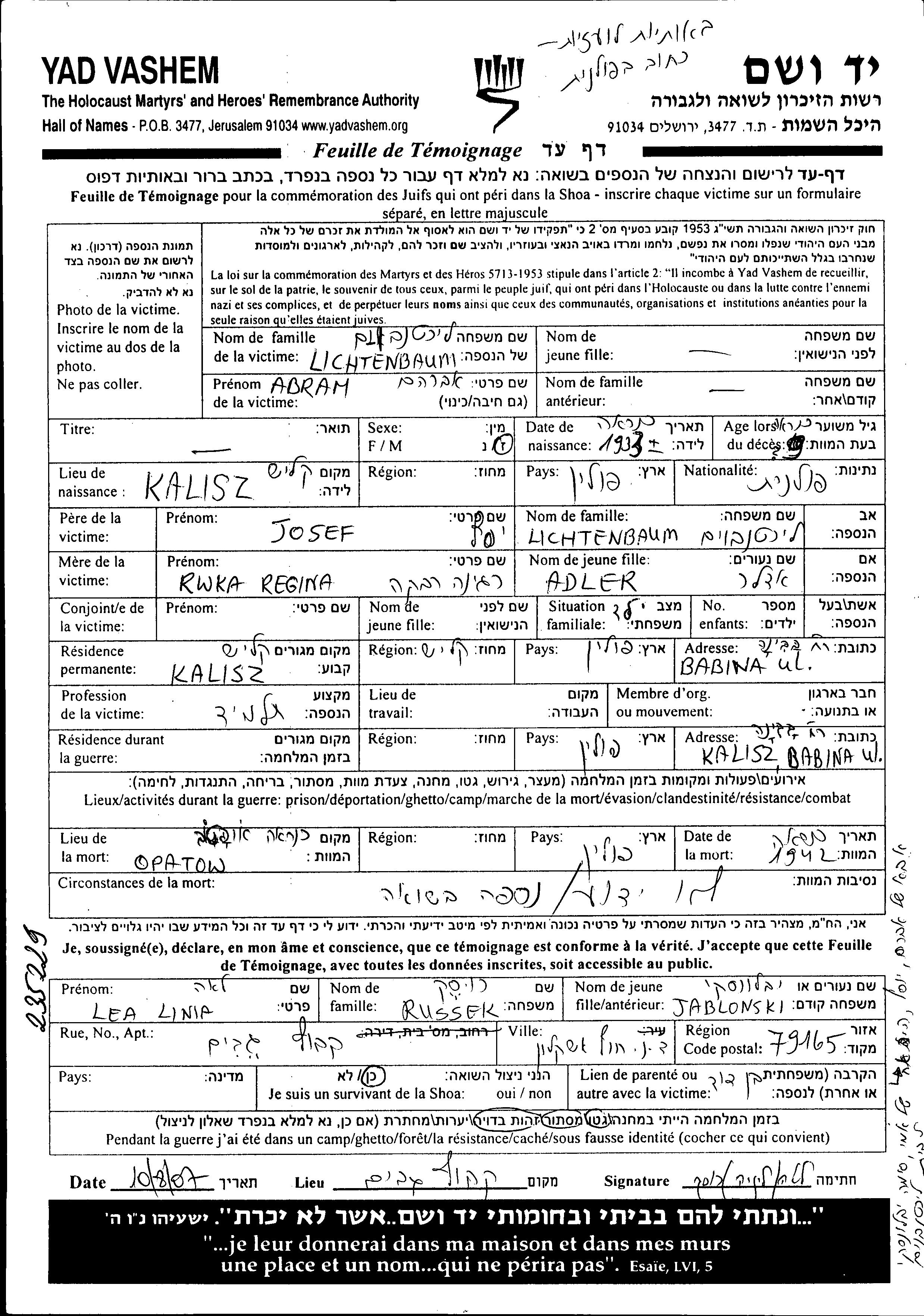 Abram Lichtenbaum wurde im Jahr 1933 in Kalisz, Polen geboren. Er war Schüler/-in. Vor dem Zweiten Weltkrieg lebte er in Kalisz, Polen.