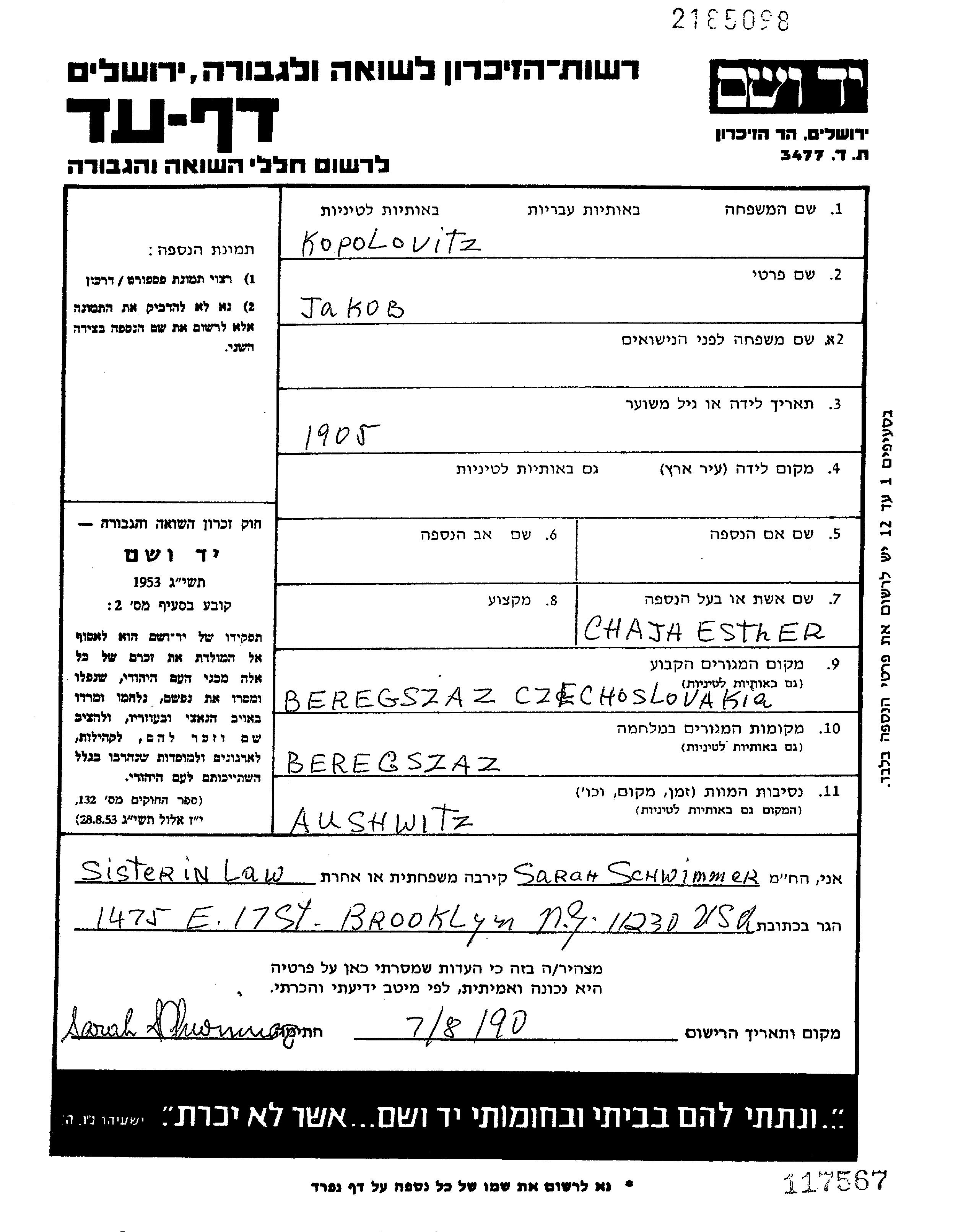 Yakow Kopolovitz wurde im Jahr 1905 geboren. Er war Kaufmann/-frau. Vor dem Zweiten Weltkrieg lebte er in Berehovo, Tschechoslowakei.