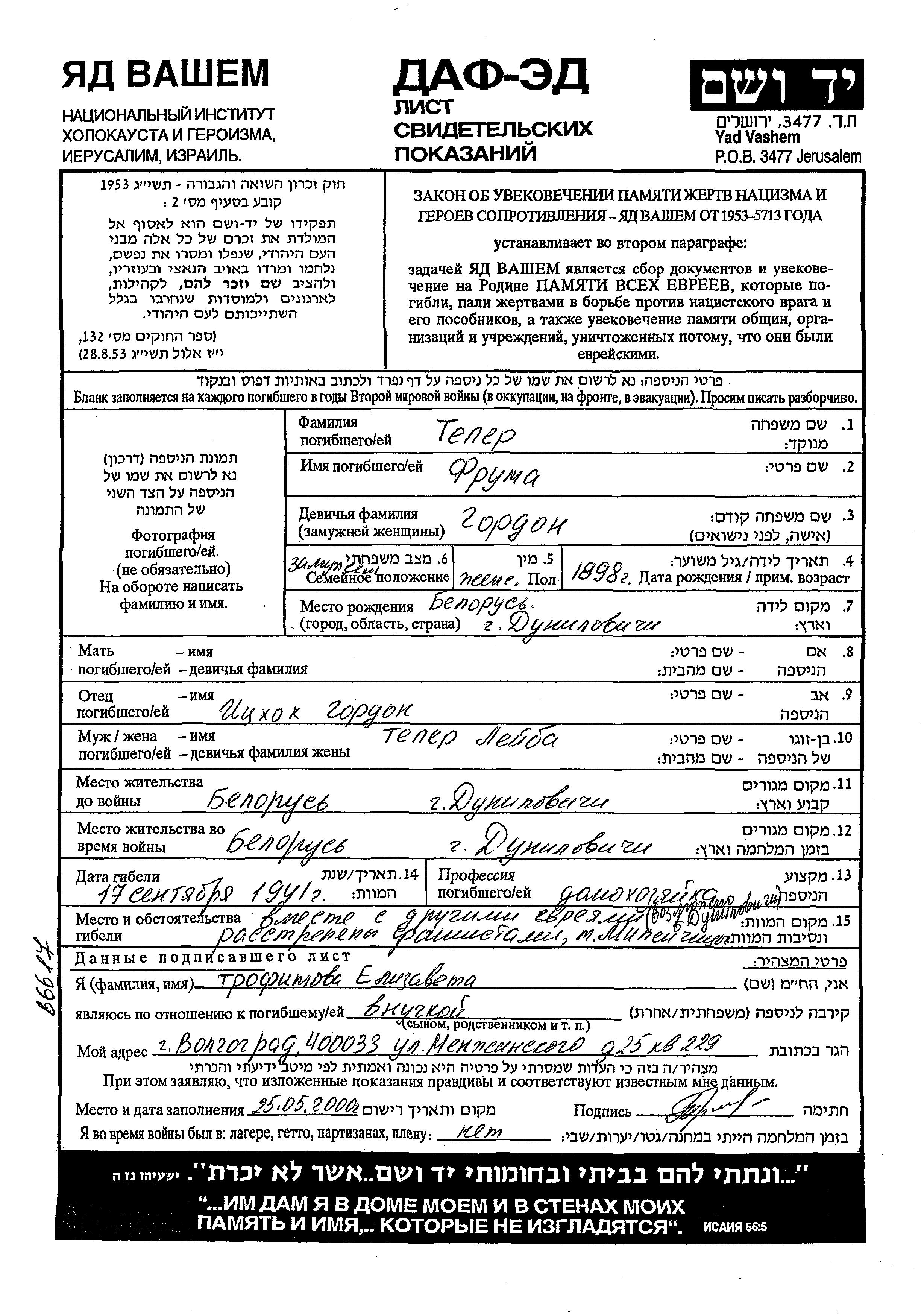 Fruma Teper, geb. Gordon wurde im Jahr 1898 in Dunilowicze, Polen geboren. Vor dem Zweiten Weltkrieg lebte sie in Dunilowicze, Polen.