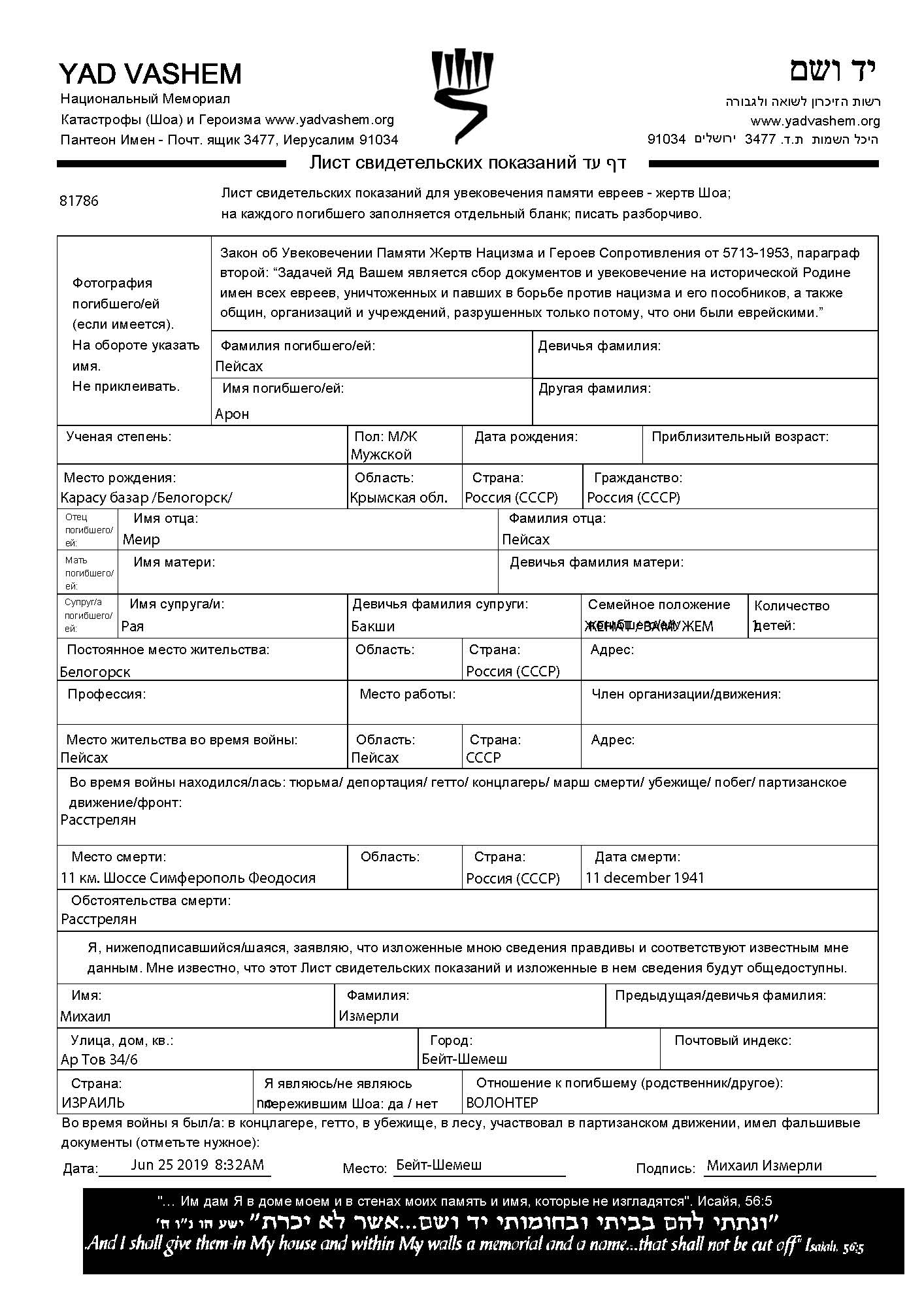 Aron Peysakh wurde im Jahr 1889 in Karasubazar, Russland (UdSSR) geboren. Vor dem Zweiten Weltkrieg lebte er in Karasubazar, Russland (UdSSR).