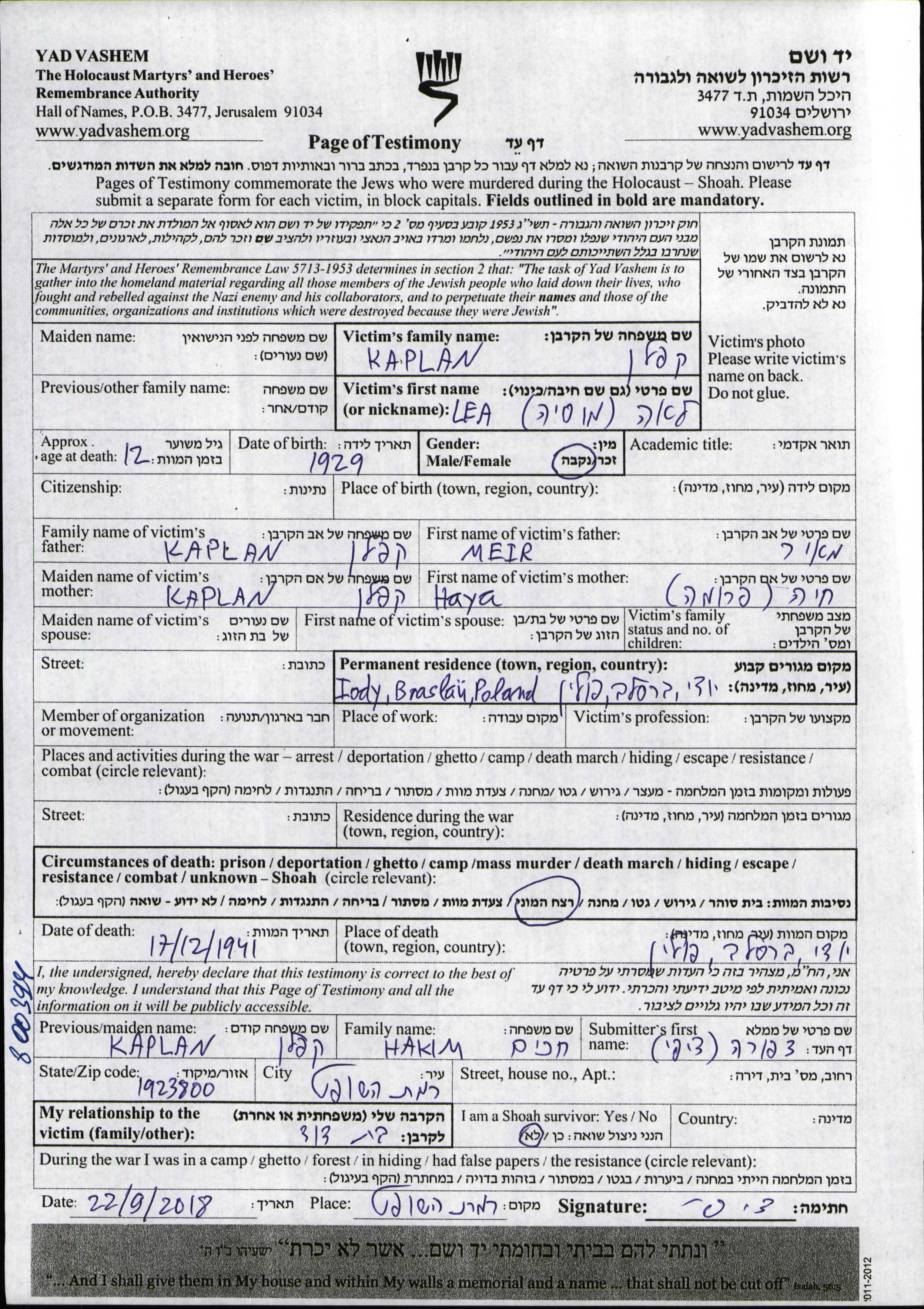 Lea Musia Kaplan wurde im Jahr 1929 geboren. Vor dem Zweiten Weltkrieg lebte sie in Jody, Polen.