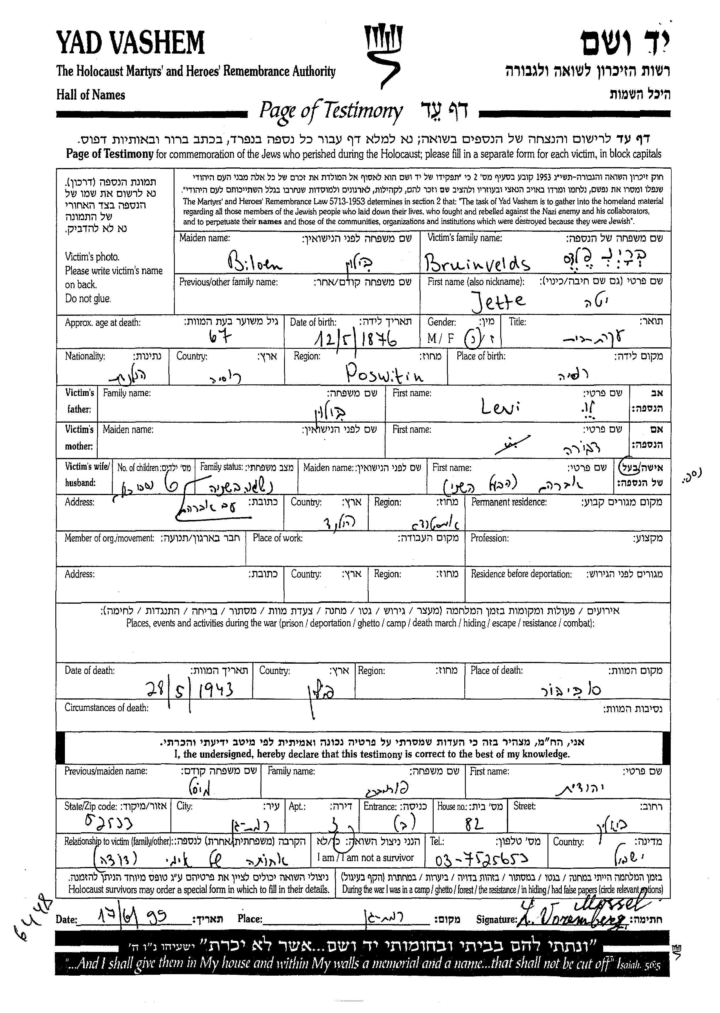 Bruinvelds | Jette | 1876 | Pasvitinys, Litauen | Liste von ermordeten Juden aus Holland |