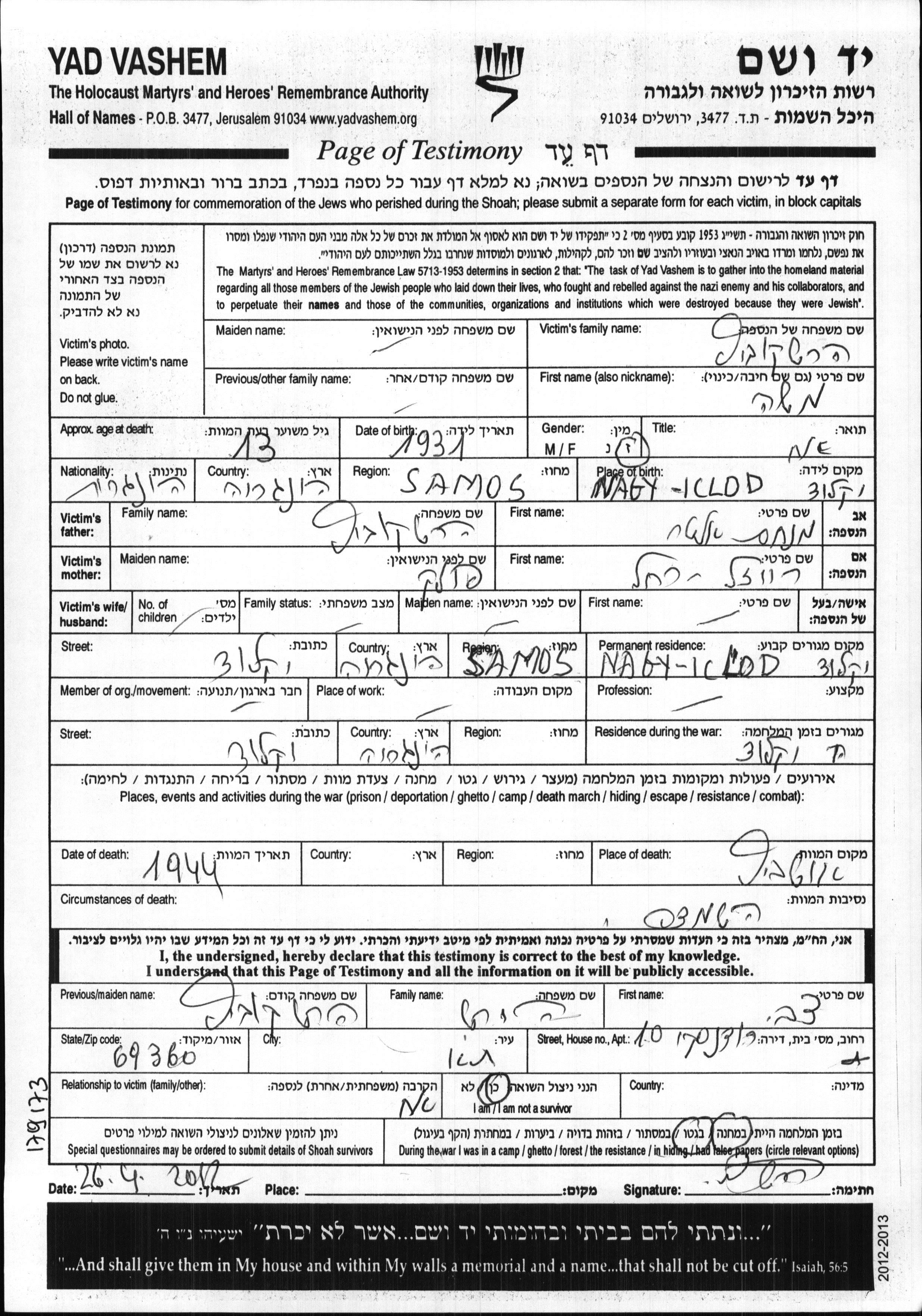 Moshe wurde in der Schoah ermordet. Todesort: Auschwitz, Polen im Jahr 1944.