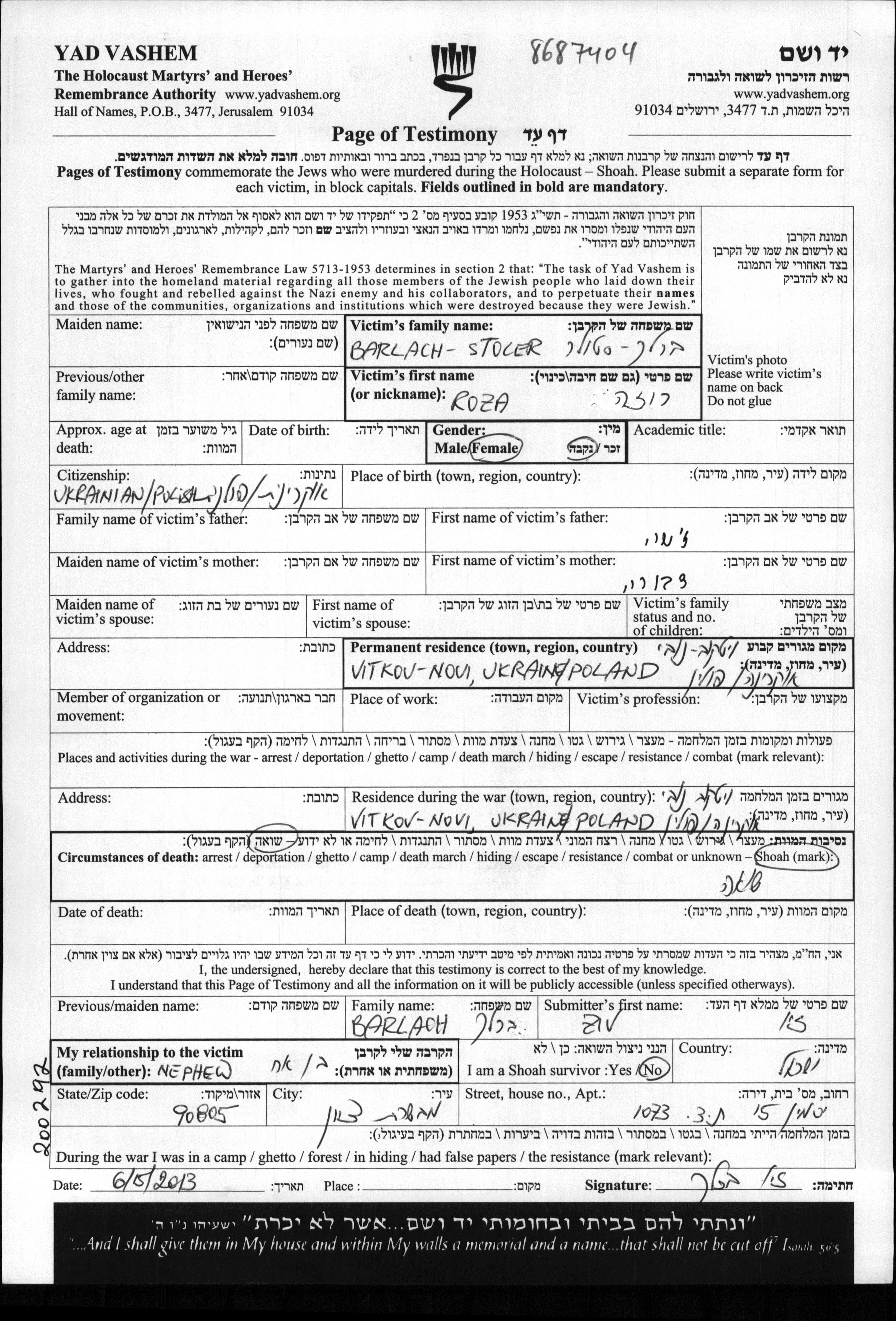 Roza wurde in der Schoah ermordet. Todesort: unbekannter Ort.