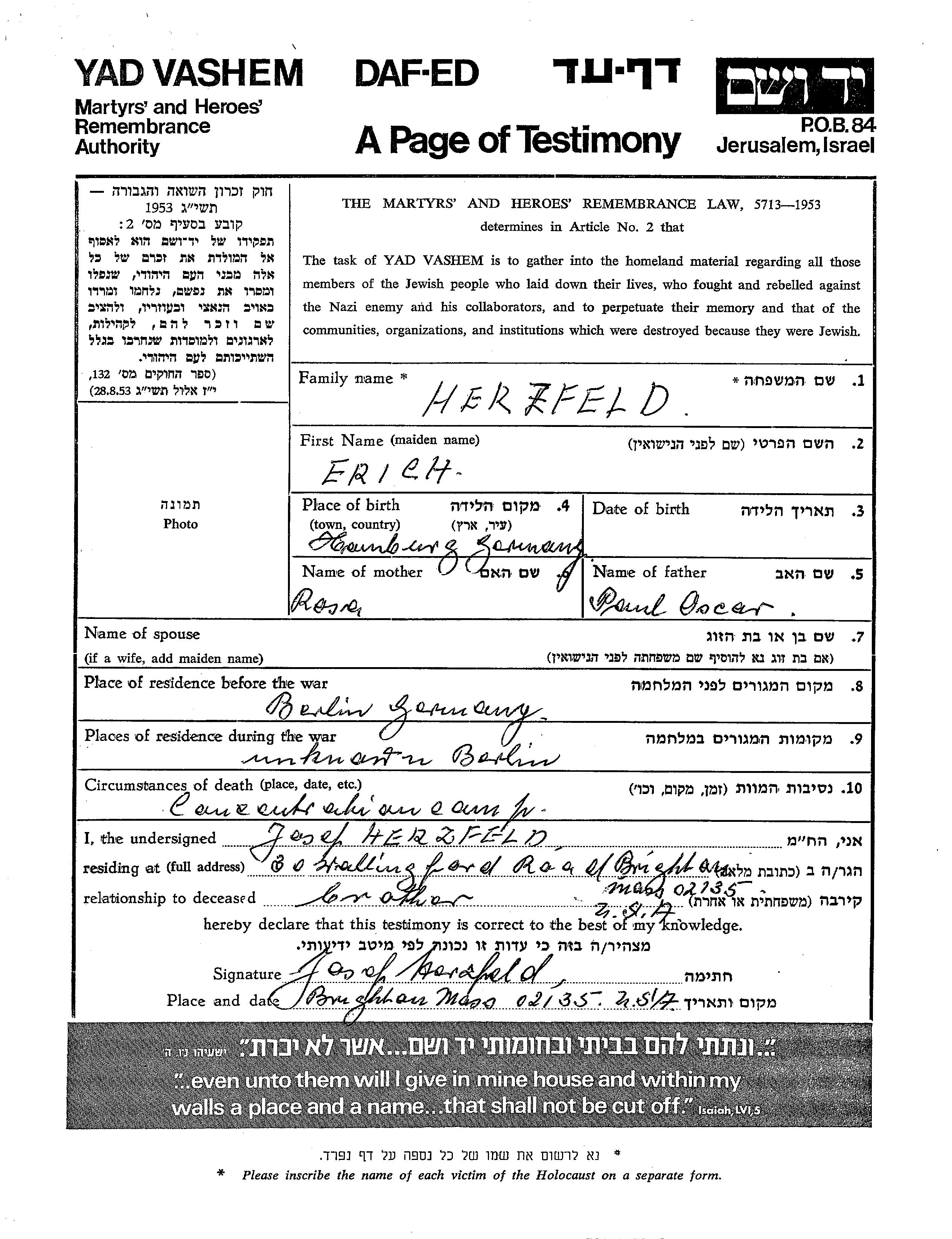 Erich Herzfeld wurde in Hamburg, Deutsches Reich geboren. Er war der Sohn von Paul Oscar und Rosa. Vor dem Zweiten Weltkrieg lebte er in Berlin, Deutsches Reich. Während des Krieges war er in Berlin, Deutsches Reich.