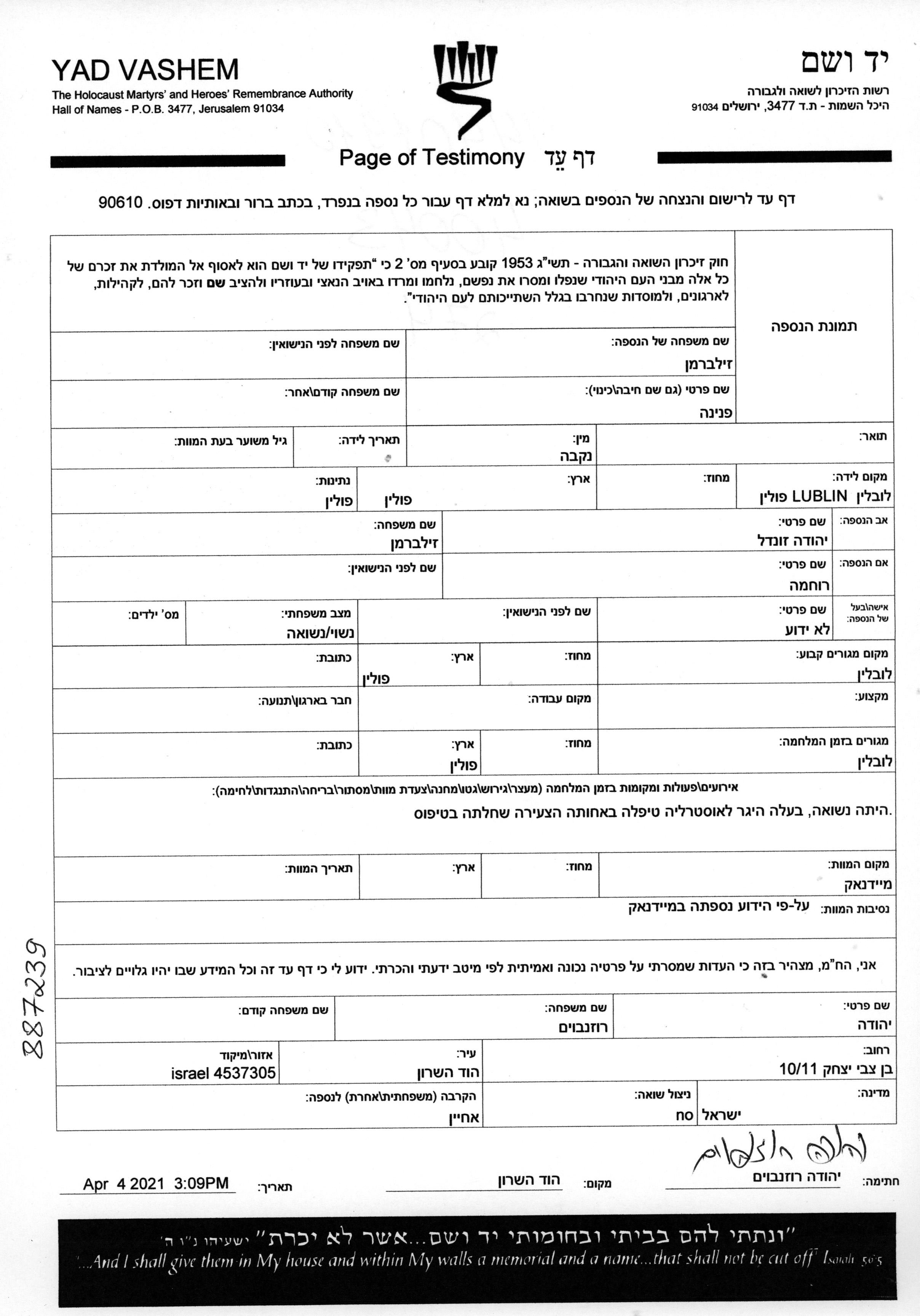 Zilberman Pnina Lublin, Polen Gedenkblatt (digital, unterzeichnet)