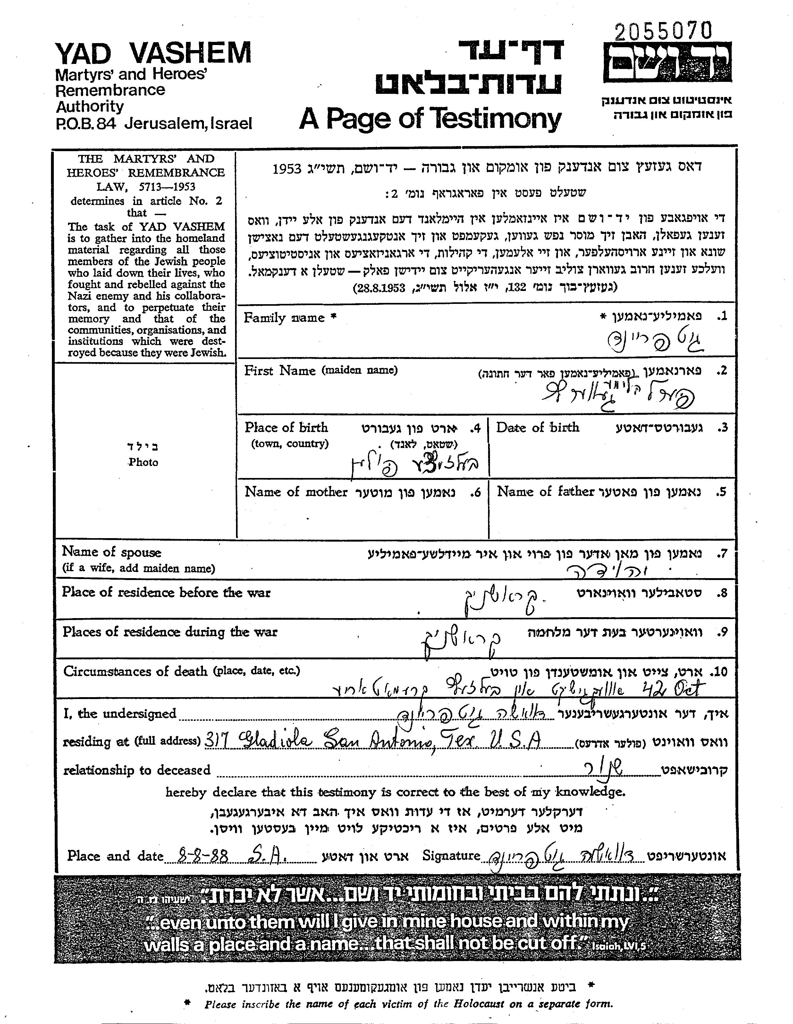 Perl Bluma Goodfriend, geb. Gewerc wurde in Belzyce, Polen geboren. Sie war Hausfrau. Vor dem Zweiten Weltkrieg lebte sie in Krašnik, Polen.