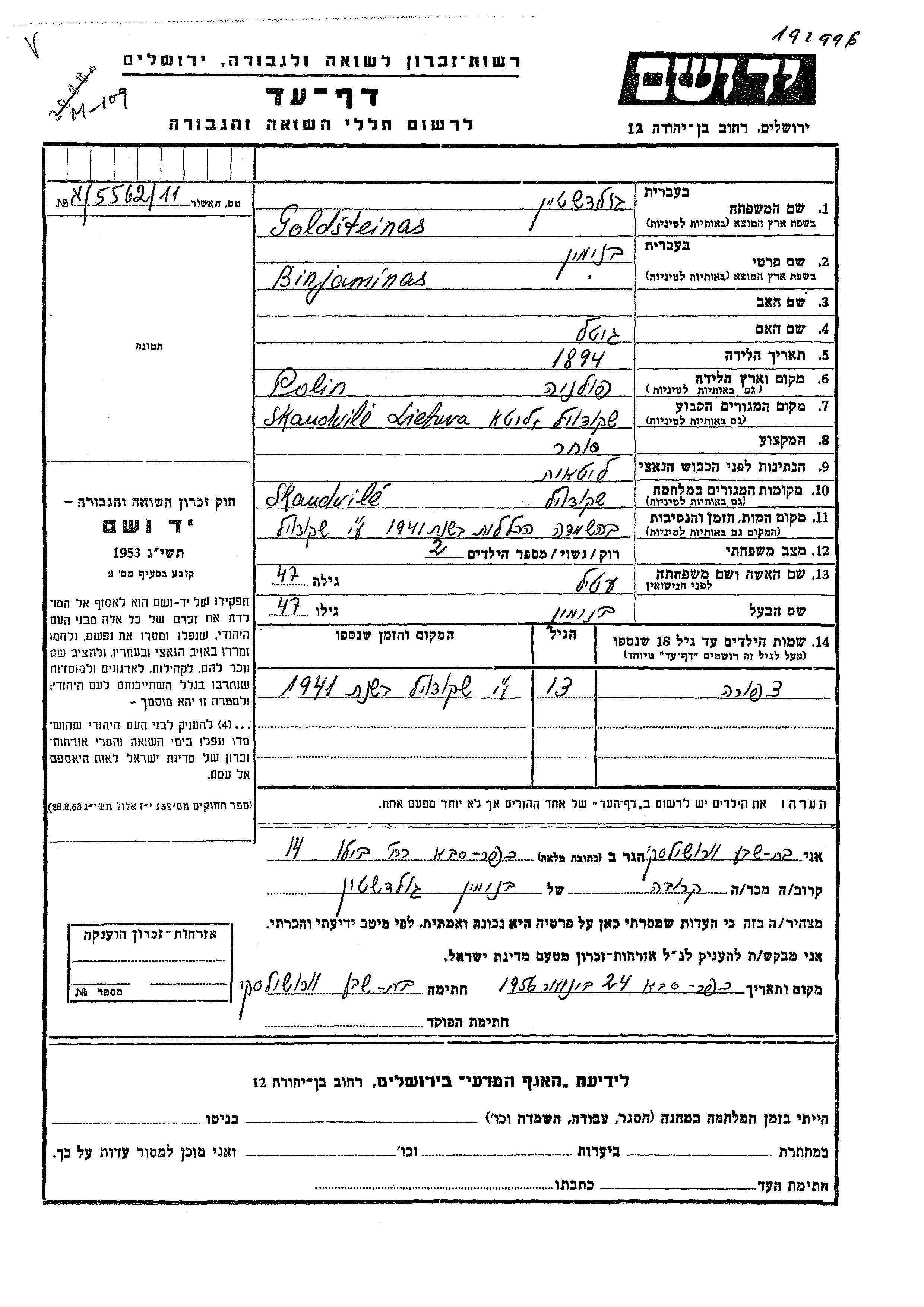 Tzipora Goldsteinas. Vor dem Zweiten Weltkrieg lebte sie in Skaudvile, Litauen.