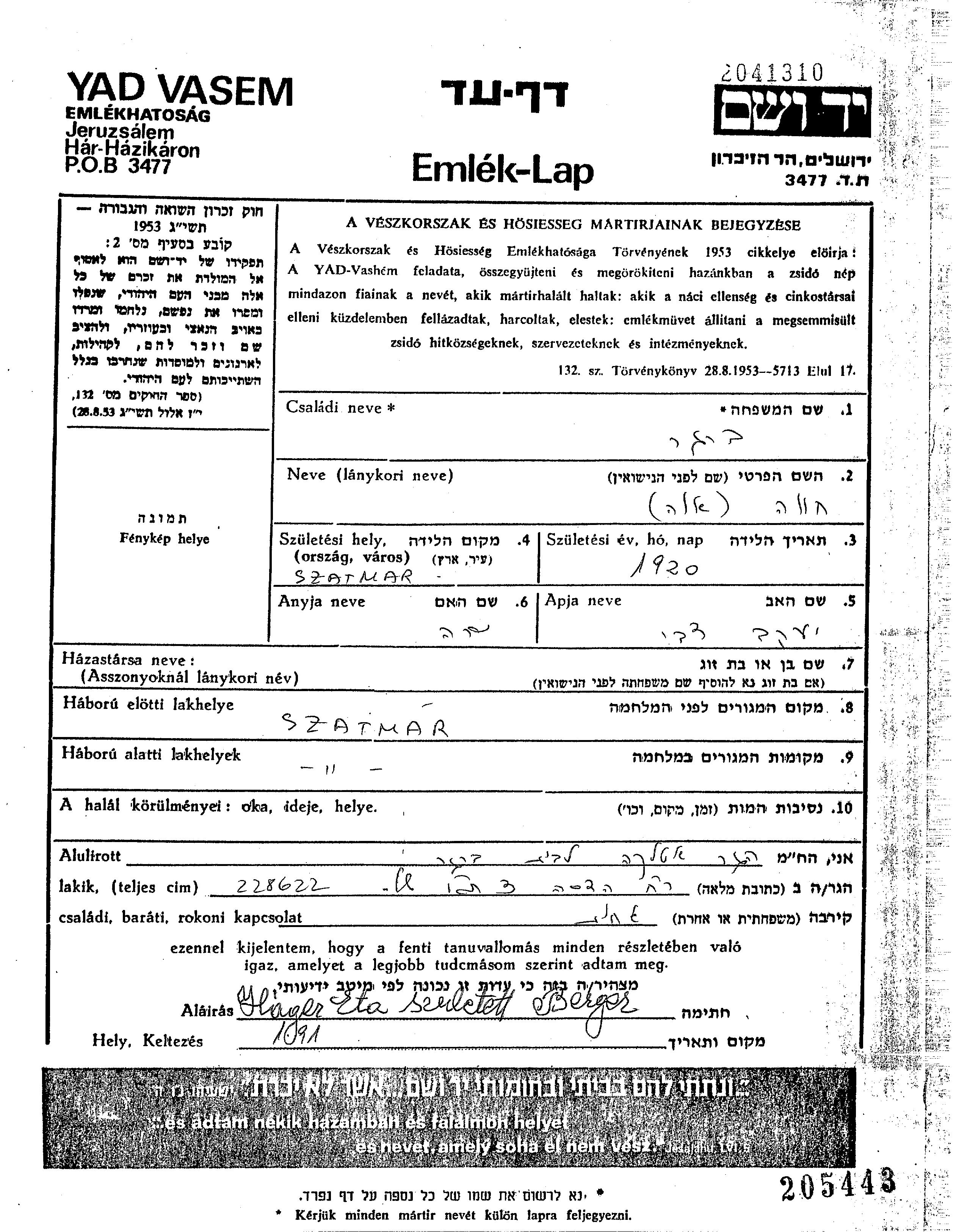 Berger Khava Eva 1920 Szatmar, Rumänien Gedenkblatt
