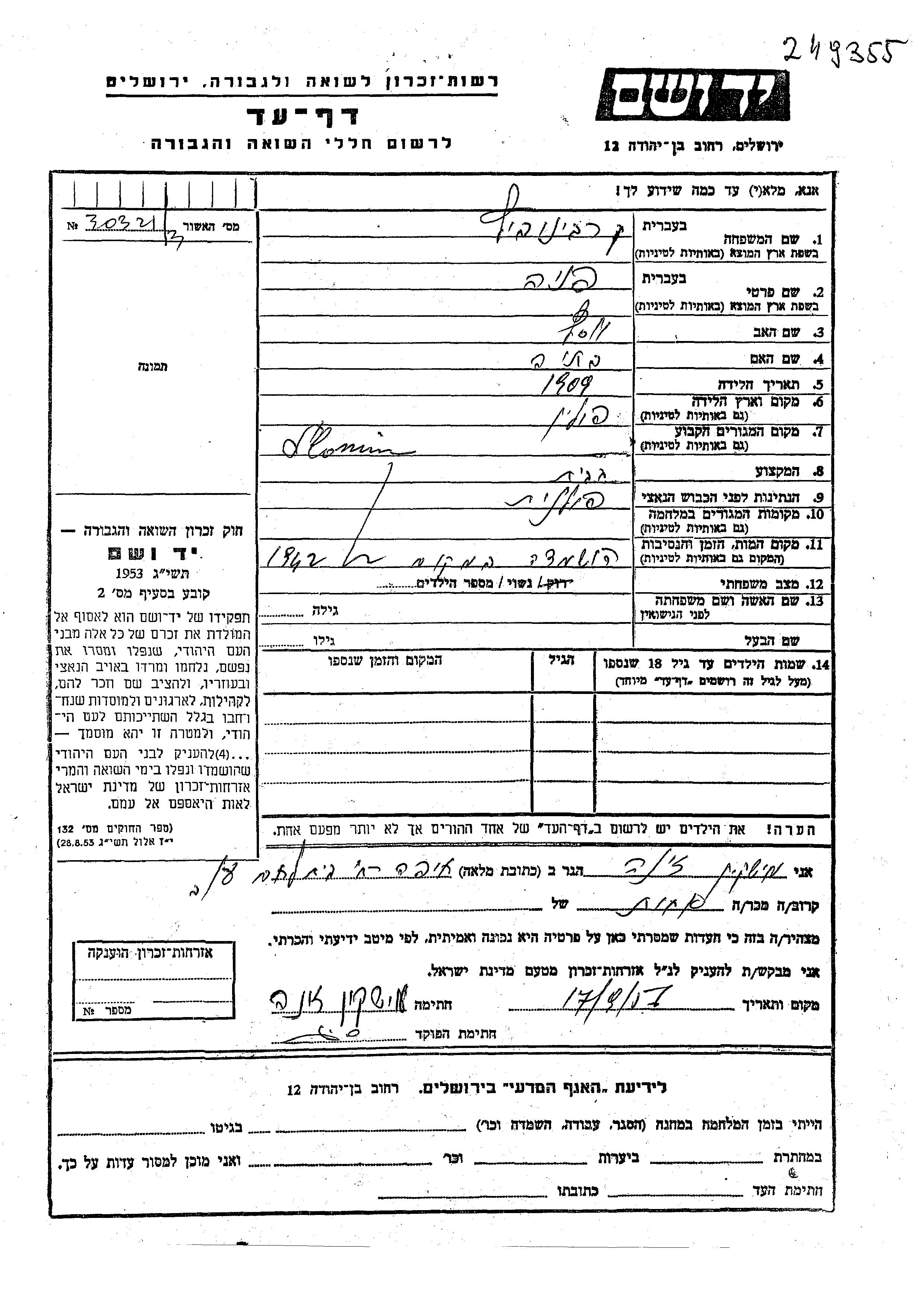 Rabinovitz Fania 1909 Slonim, Polen Gedenkblatt