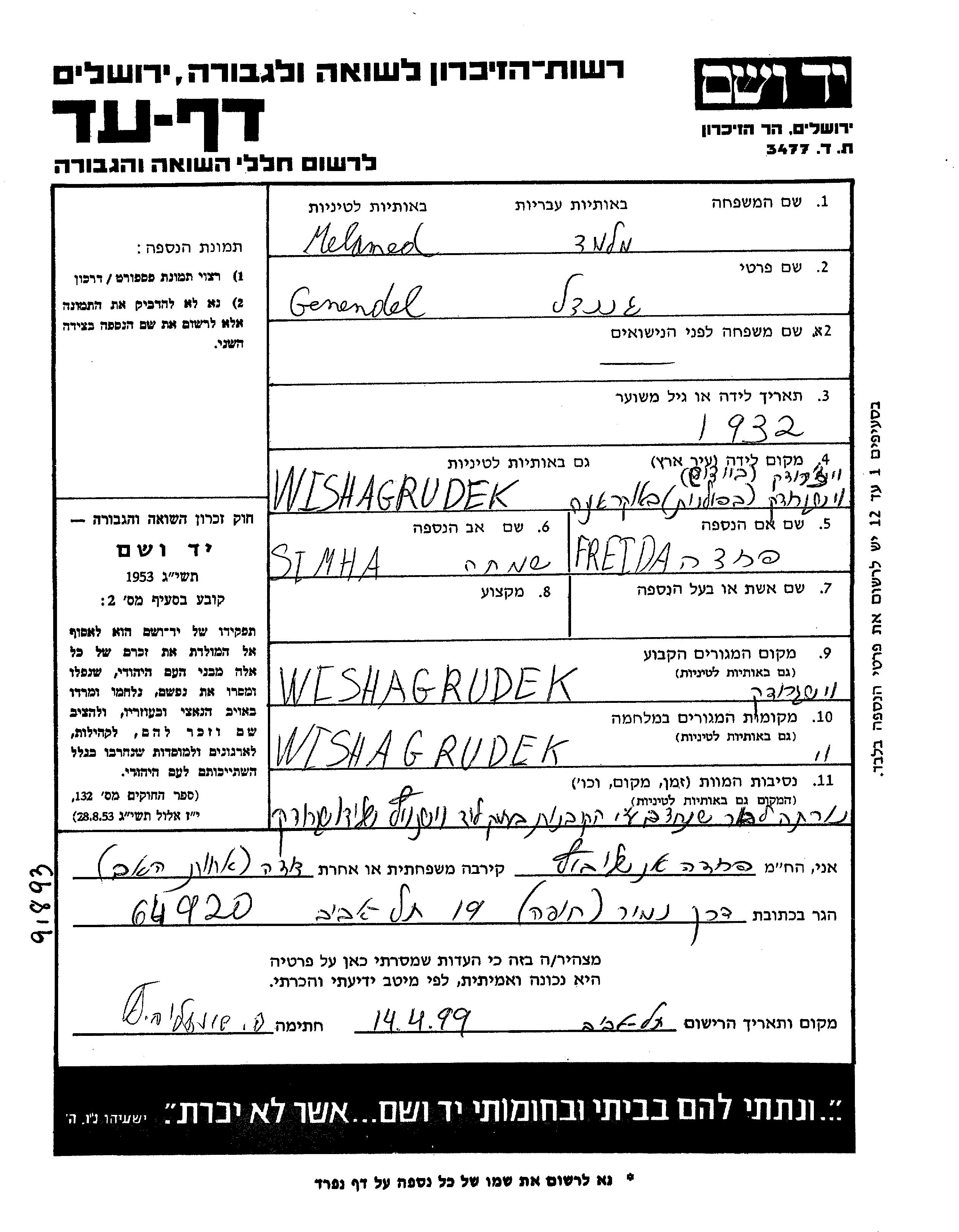 Genendel wurde in der Schoah ermordet. Todesort: Wiszniowiec, Polen.