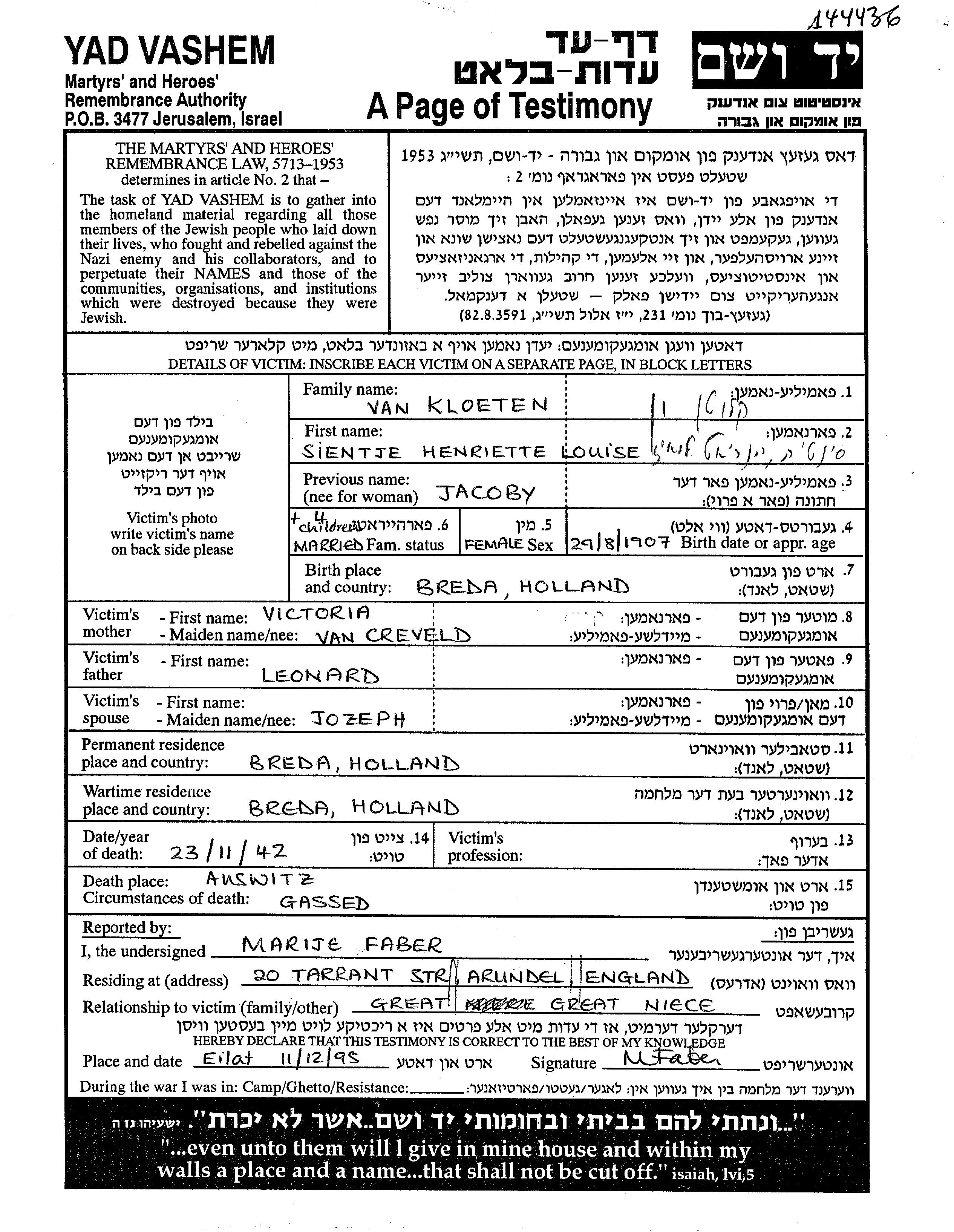 Sientje Henriette Louisette Kloeten van, geb. Jacobij wurde im Jahr 1907 in Breda, Niederlande geboren. Vor dem Zweiten Weltkrieg lebte sie in Breda, Niederlande.