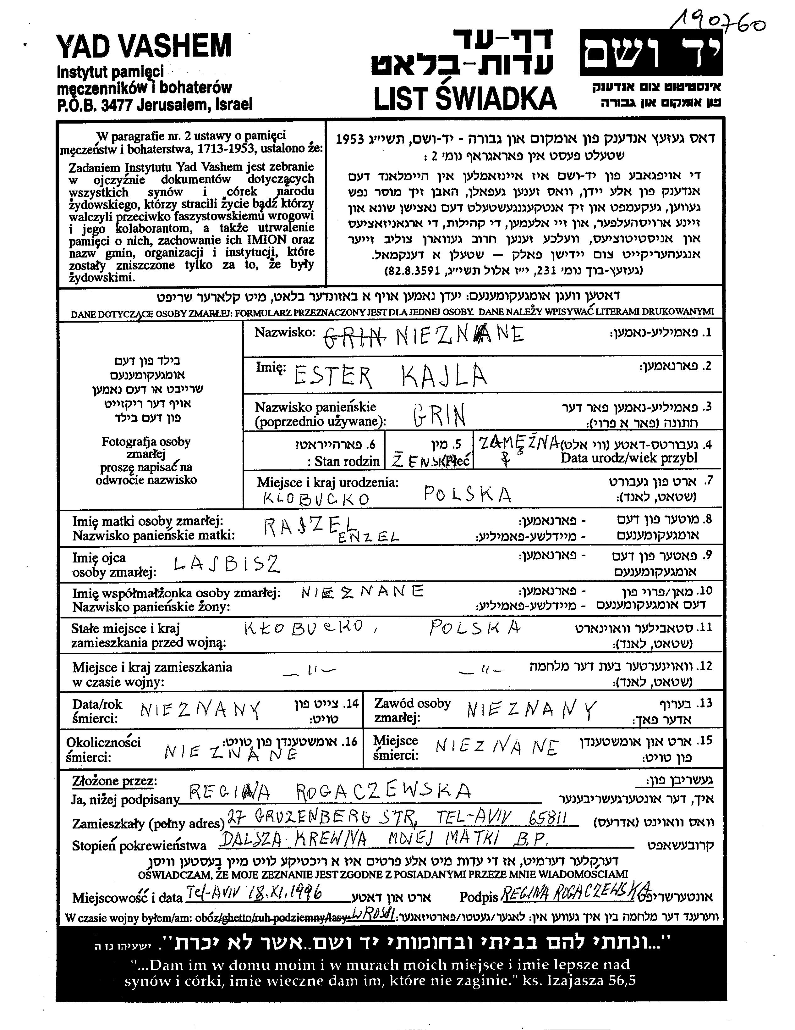 Kajla Estera Grin Name unbekannt, geb. Grin wurde im Jahr 1900 in Klobuck, Polen geboren. Sie war Hausfrau. Vor dem Zweiten Weltkrieg lebte sie in Klobuck, Polen.