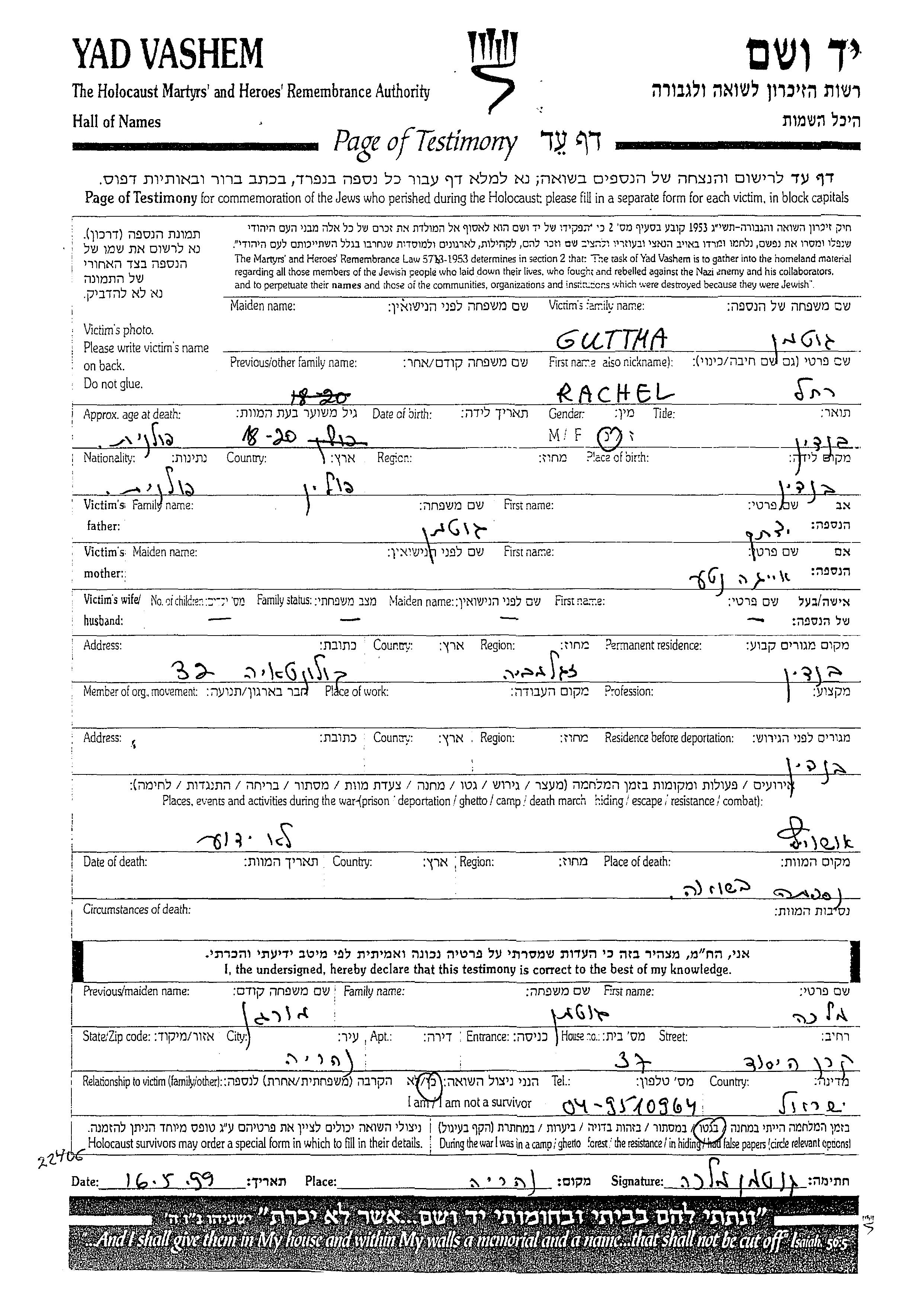 Guttman Rachel 1922 Bendin, Polen Gedenkblatt
