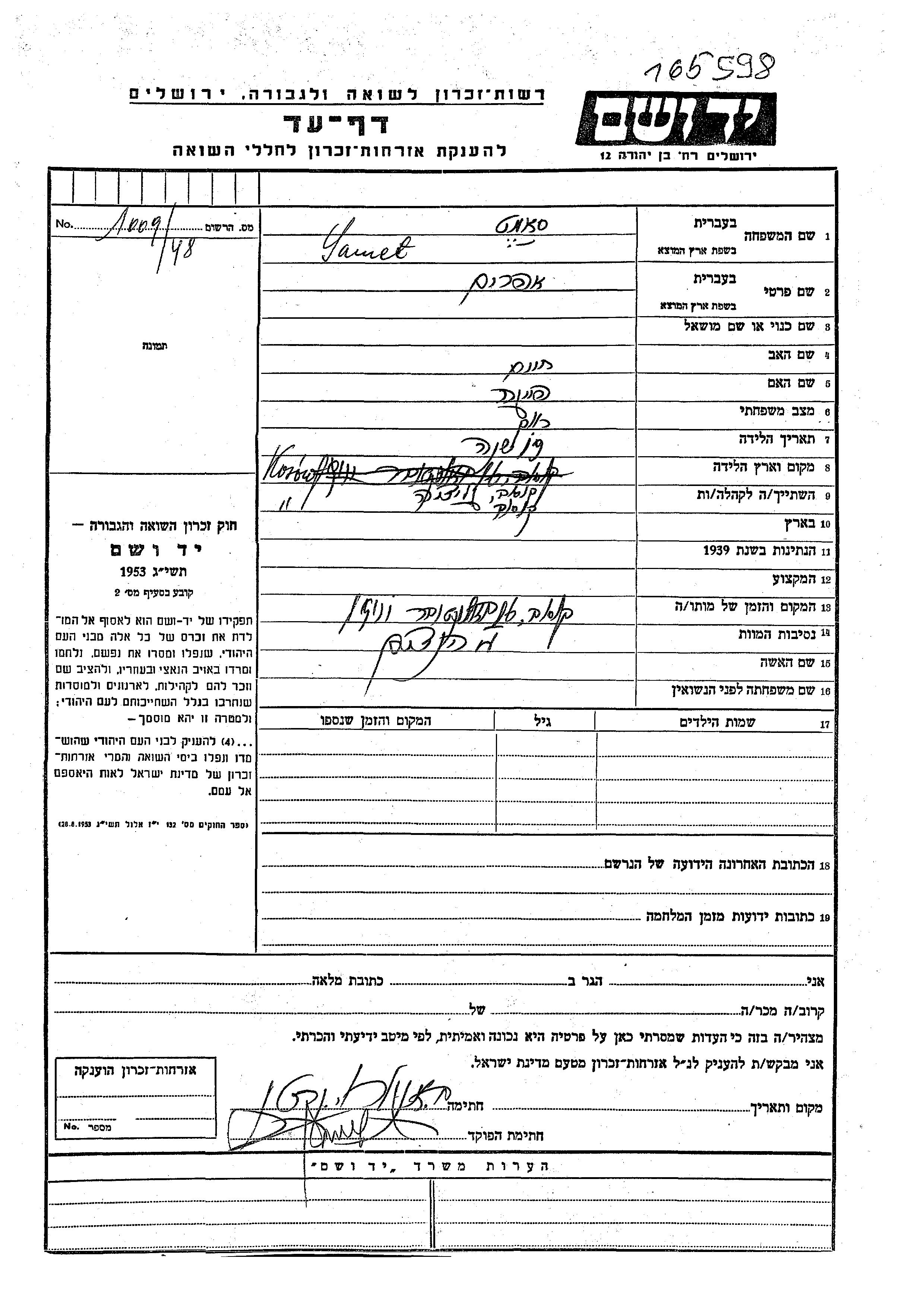 Efraim Samet wurde in Kosow, Polen geboren. Vor dem Zweiten Weltkrieg lebte er in Kosow Pokucki, Polen. Efraim wurde in der Schoah ermordet. Todesort: Kosow, Polen im Jahr 16/10/1941.