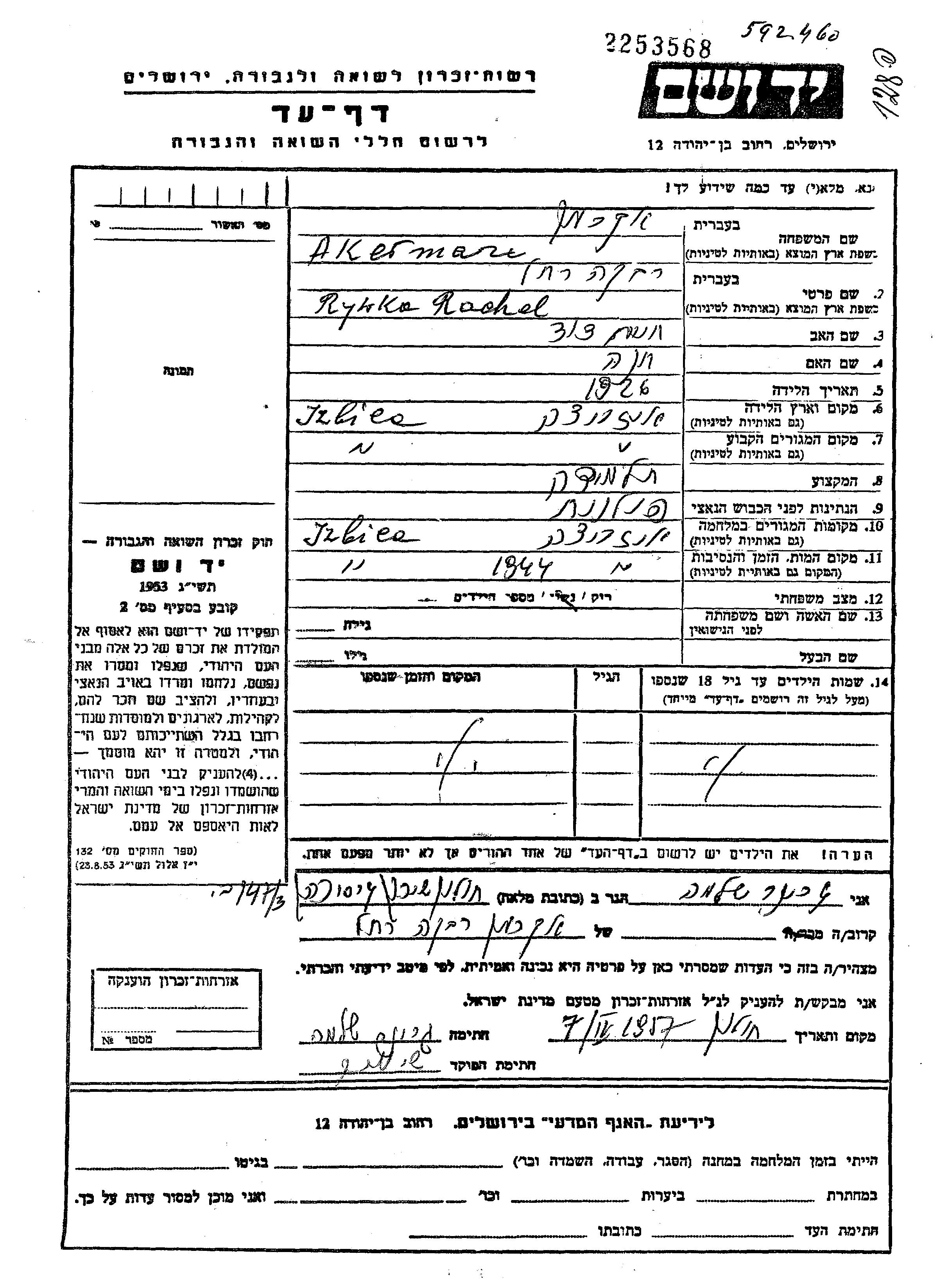 Akerman Rywka Rachel 1926 Izbica, Polen Gedenkblatt