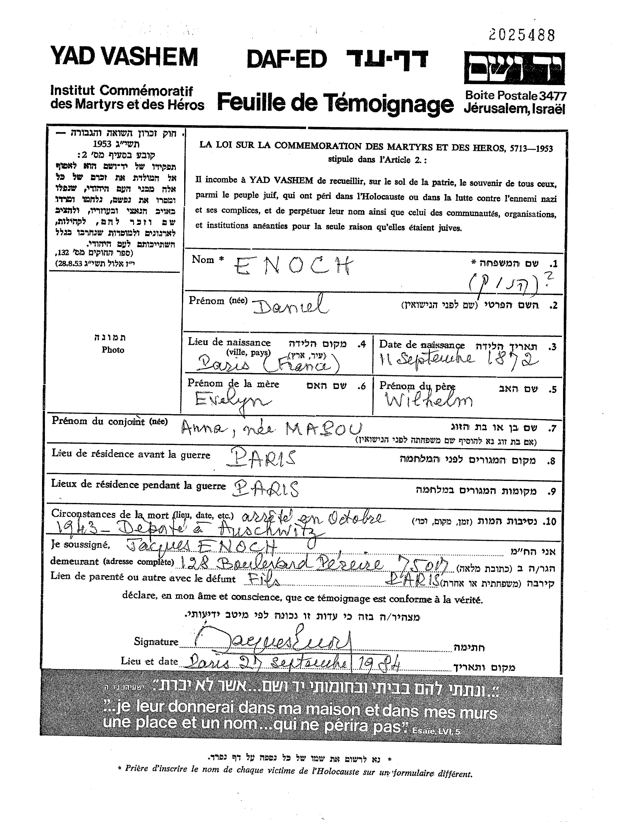 Daniel Enoch Henokh wurde im Jahr 1872 in Paris, Frankreich geboren. Vor dem Zweiten Weltkrieg lebte er in Paris, Frankreich.
