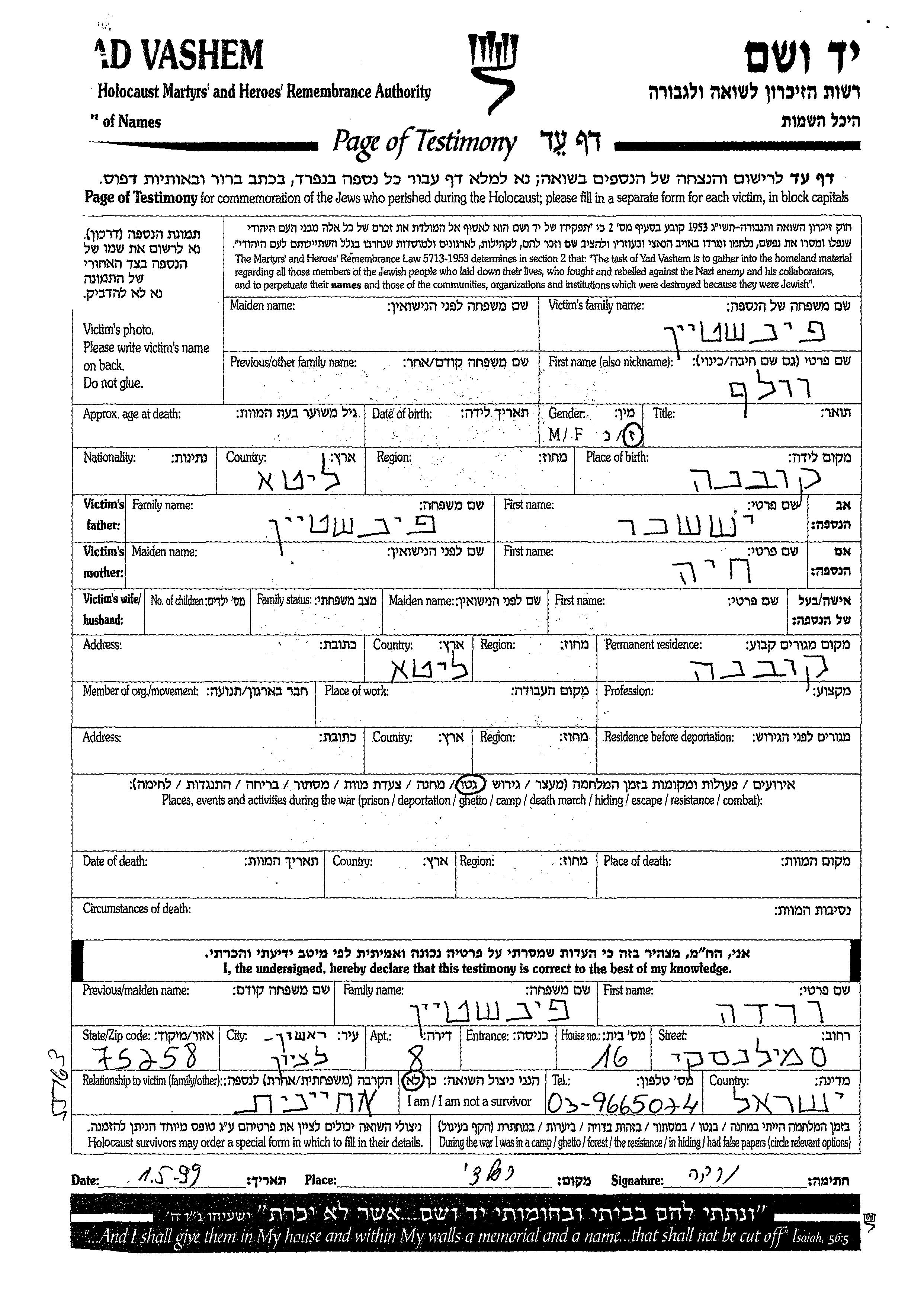 Fainstein Zeev Natan 1922 Kowna, Litauen Gedenkblatt