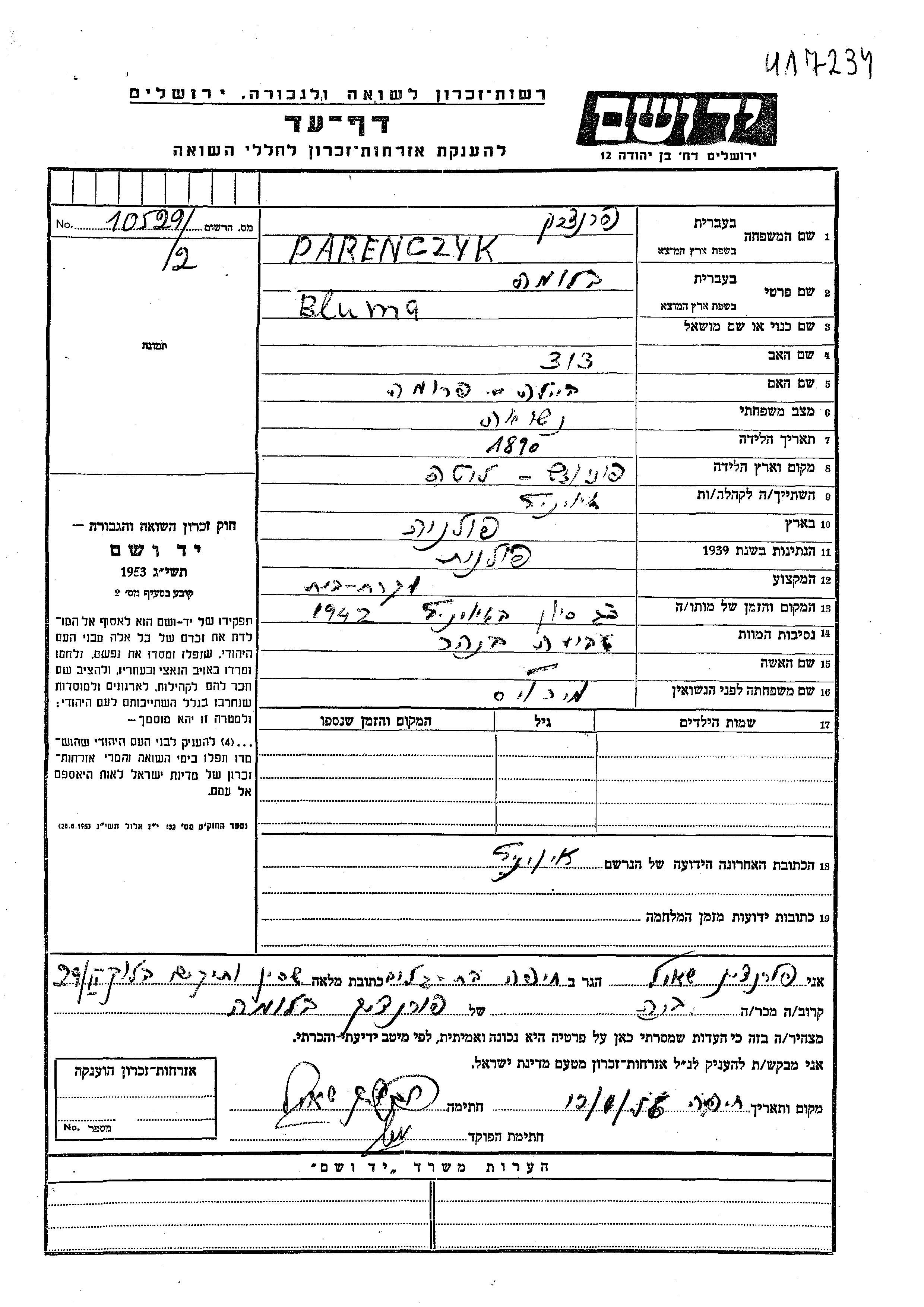 Bluma Parenczyk, geb. Veis wurde im Jahr 1890 in Panevezys, Litauen geboren. Sie war die Tochter von David und Beila Fruma. Sie war mit Mia Verheiratet. Vor dem Zweiten Weltkrieg lebte sie in Iwieniec, Polen. Während des Krieges war sie in Iwieniec, Polen.
