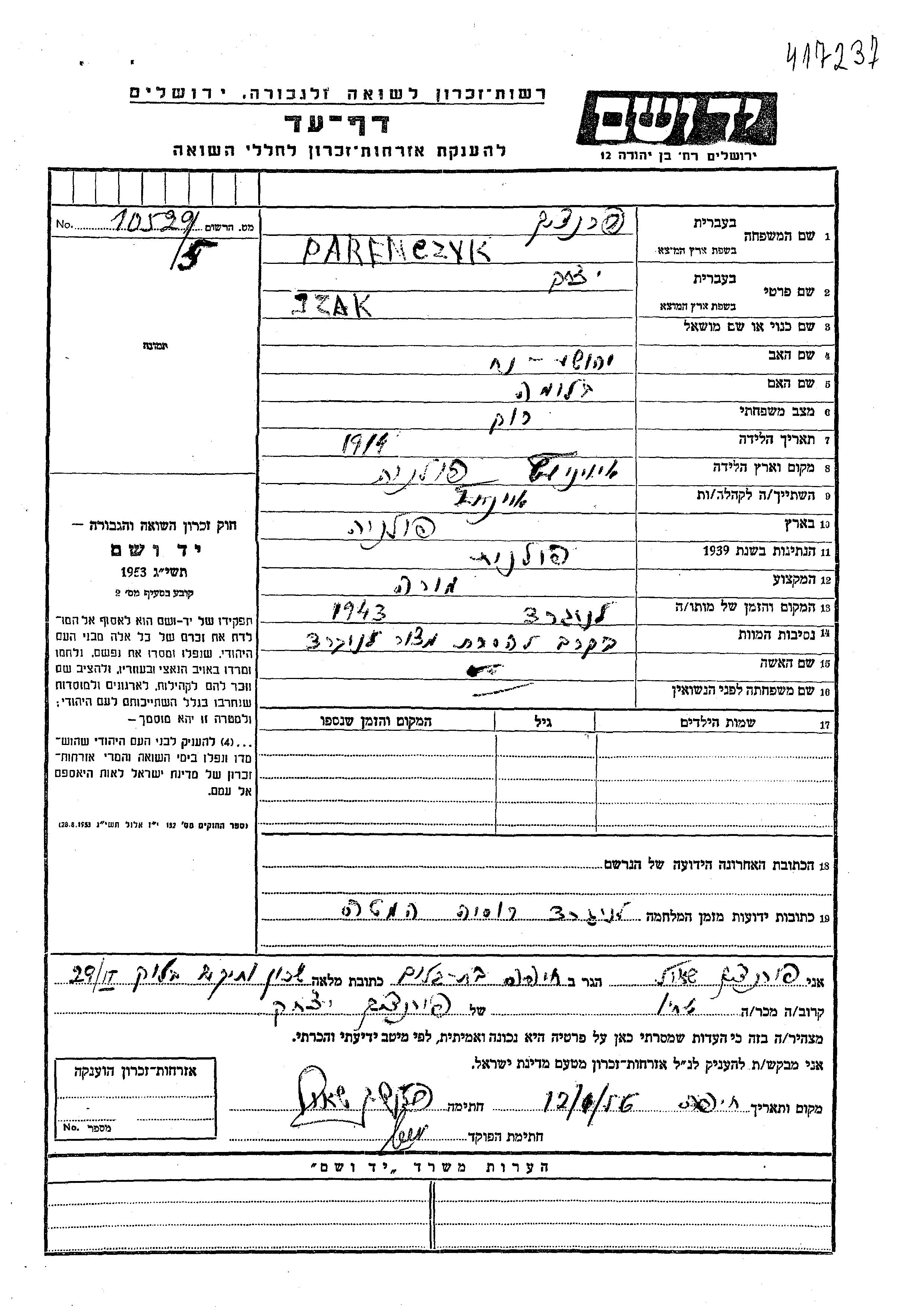 Yzak Parenczyk wurde im Jahr 1914 in Iwieniec, Polen geboren. Er war der Sohn von Yehoshua Noakh und Bluma. Er war Lehrer/in und Ledig. Vor dem Zweiten Weltkrieg lebte er in Iwieniec, Polen. Während des Krieges war er in Leningrad, Russland (UdSSR).