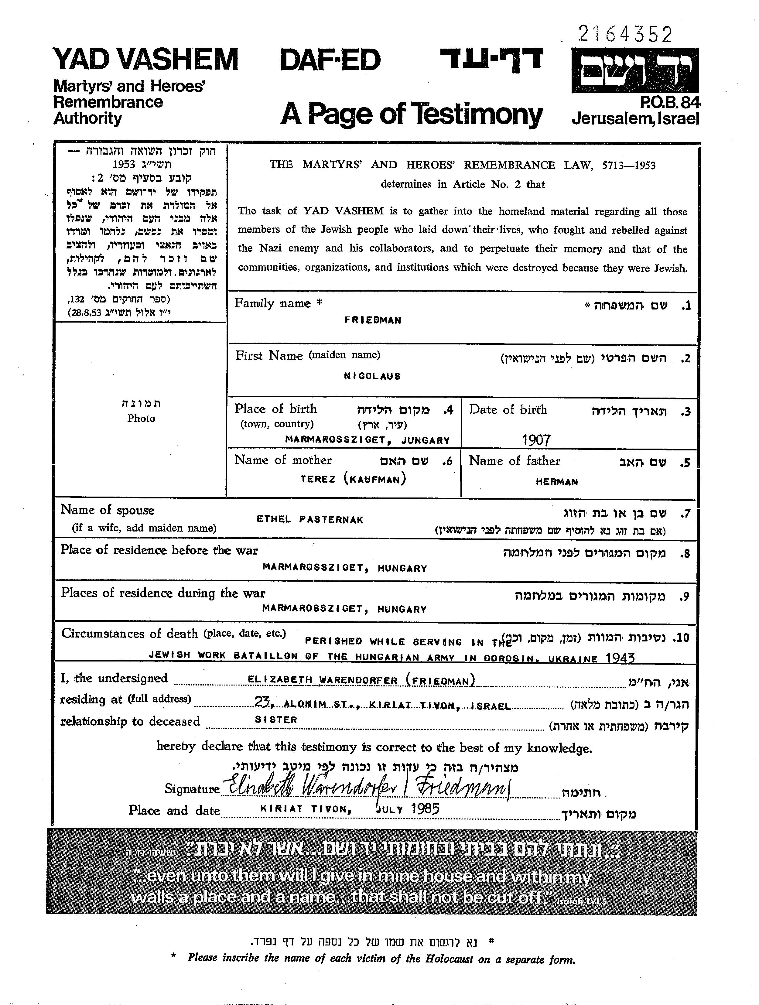 Miklos Nicolaus Friedmann wurde im Jahr 1907 in Maramarossziget, Rumänien geboren. Vor dem Zweiten Weltkrieg lebte er in Maramarossziget, Rumänien.