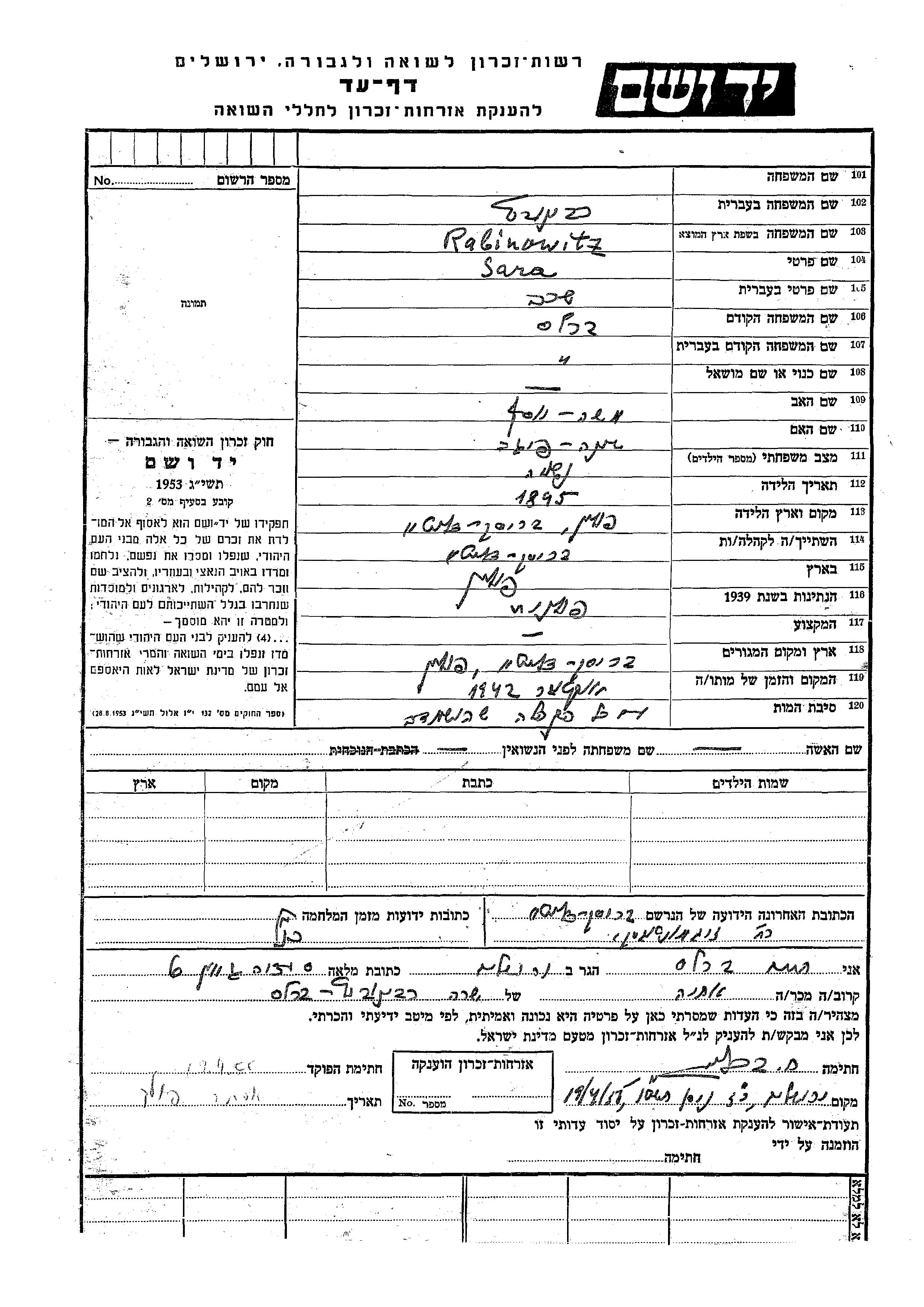 Sara Rabinowicz, geb. Barlas wurde im Jahr 1895 in Brisk d Lita, Polen geboren. Vor dem Zweiten Weltkrieg lebte sie in Brisk d Lita, Polen.