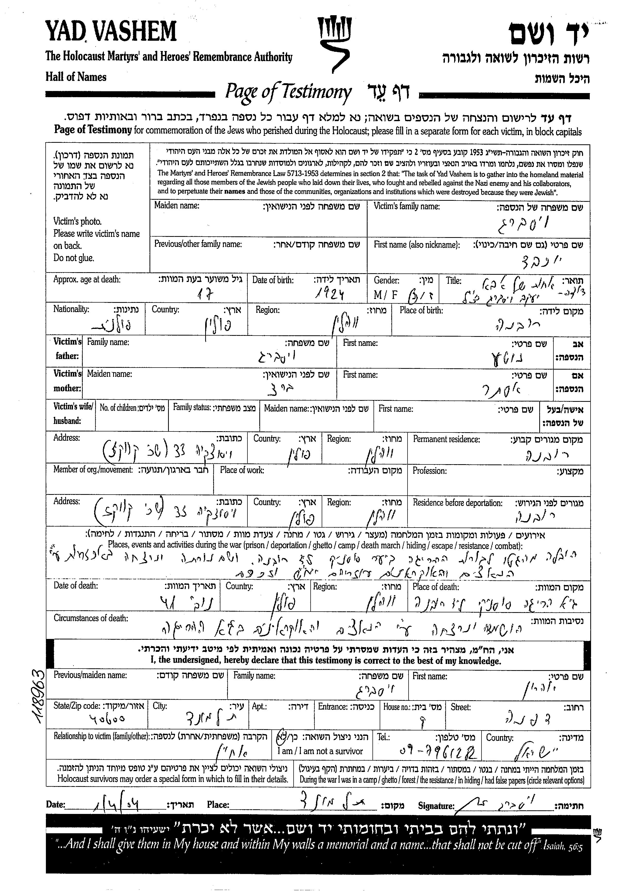 Veisberg | Yokheved | 1924 | Rowne, Polen | Gedenkblatt |