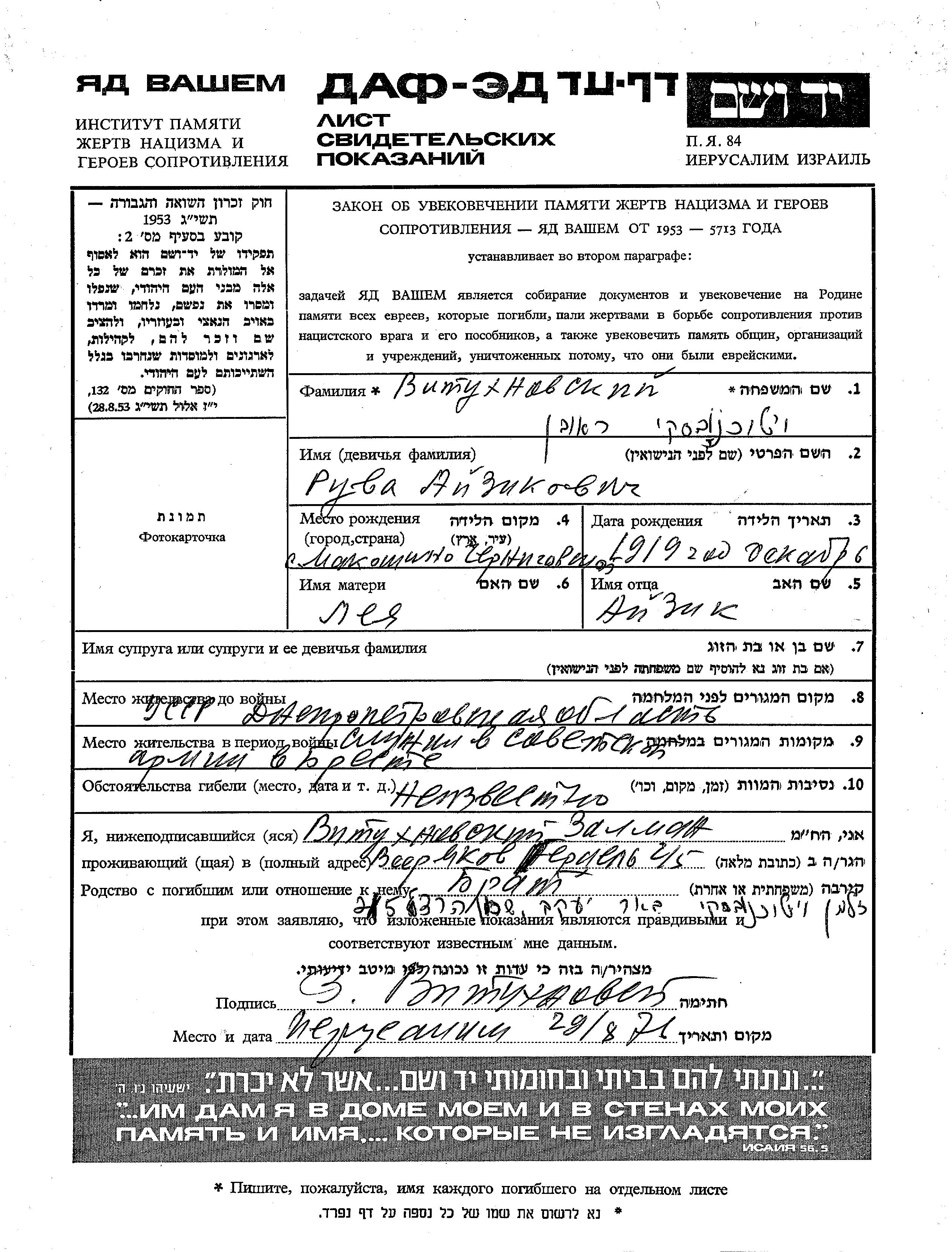 Ruva Vitukhnovski wurde im Jahr 1919 in Makoshino, Ukraine (UdSSR) geboren. Er war der Sohn von Aizik und Lea. Vor dem Zweiten Weltkrieg lebte er in Ukraine (UdSSR). Während des Krieges war er in die Sowjetischen Streitkräfte.