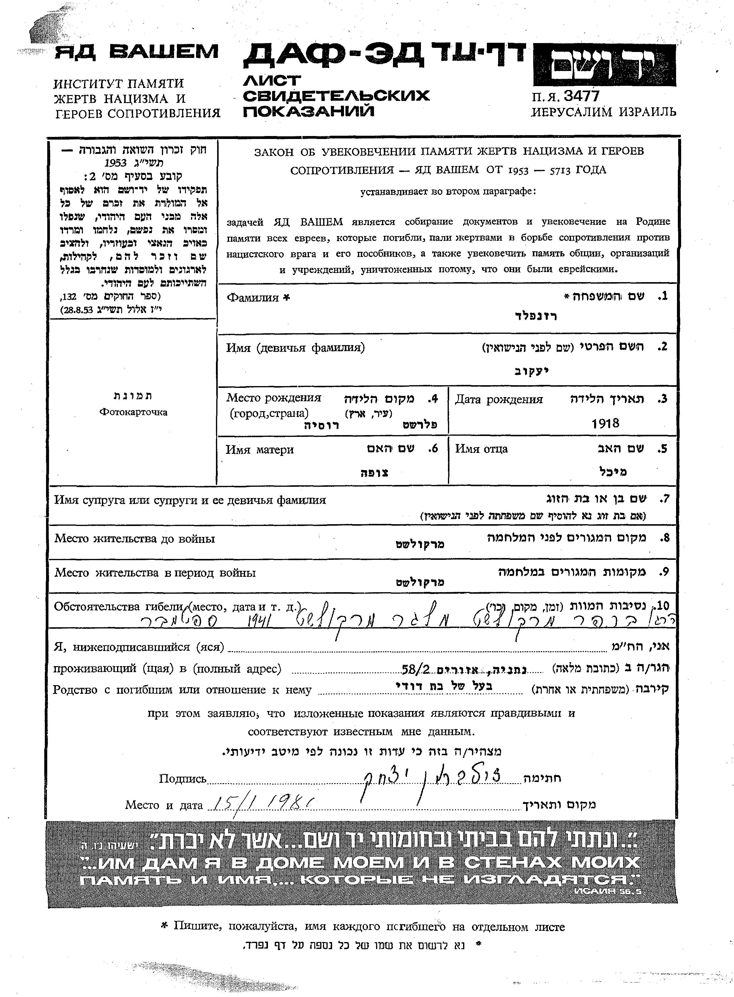 Yaakov Razenfeld wurde im Jahr 1918 in Floresti, Rumänien geboren. Er war der Sohn von Mikhel und Tzipora. Er war Ledig. Vor dem Zweiten Weltkrieg lebte er in Marculesti, Rumänien. Während des Krieges war er in Marculesti, Rumänien.