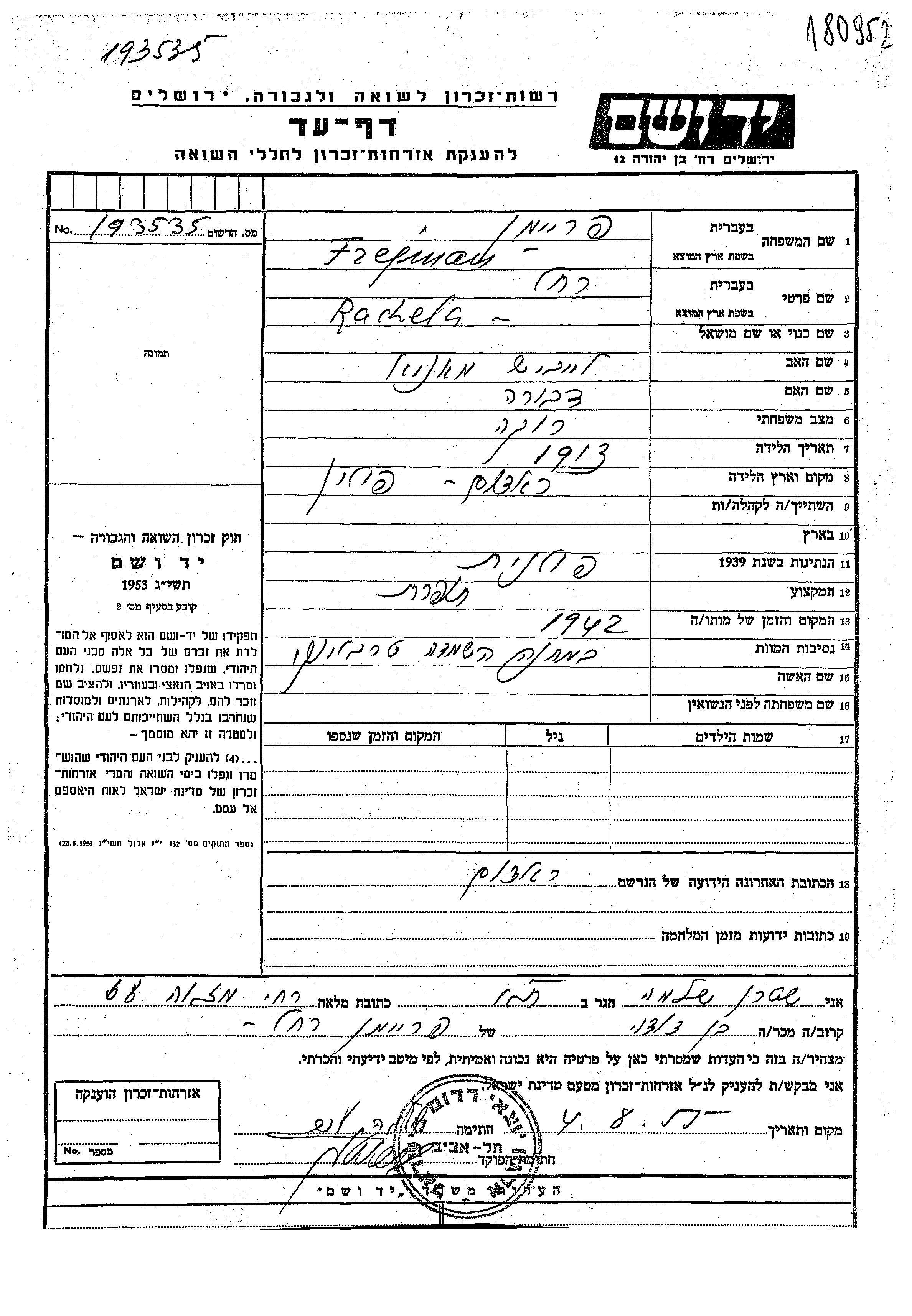 Freiman Friman Rakhel Radom, Polen Gedenkblatt