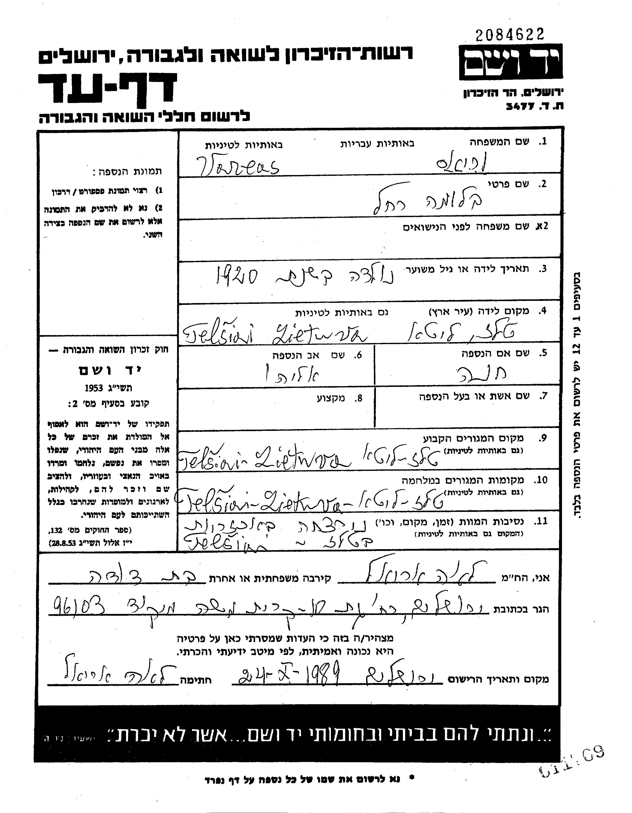 Vareas | Bluma Rakhel | 1920 | Telsiai, Litauen | Gedenkblatt |