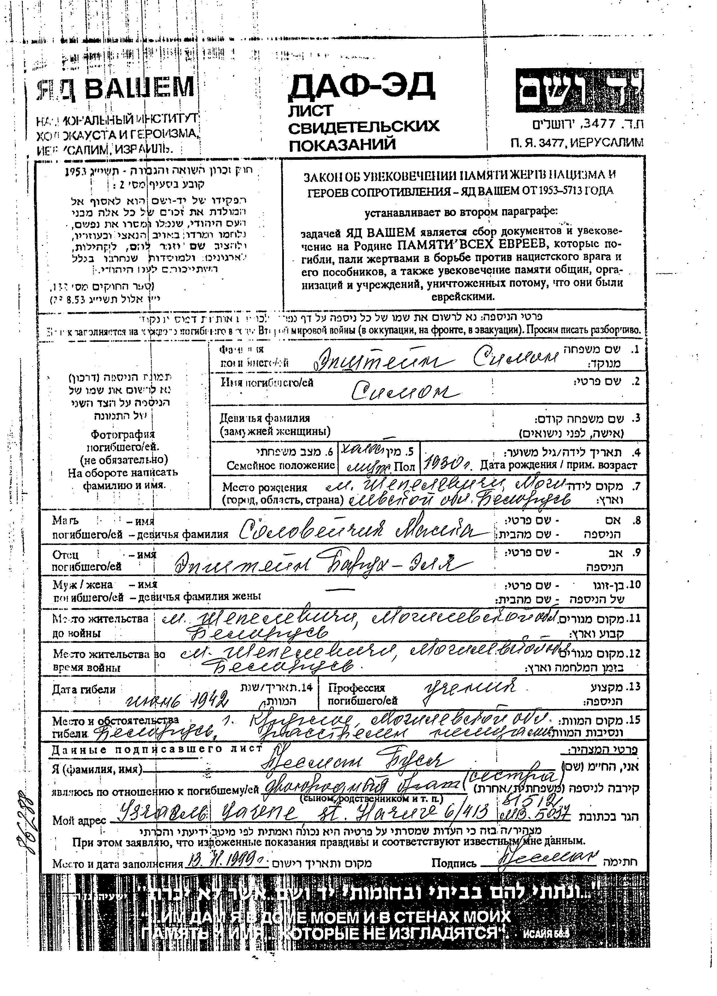 Epshtein Simon 1930 Shepelevichi, Weißrussland (UdSSR) Gedenkblatt