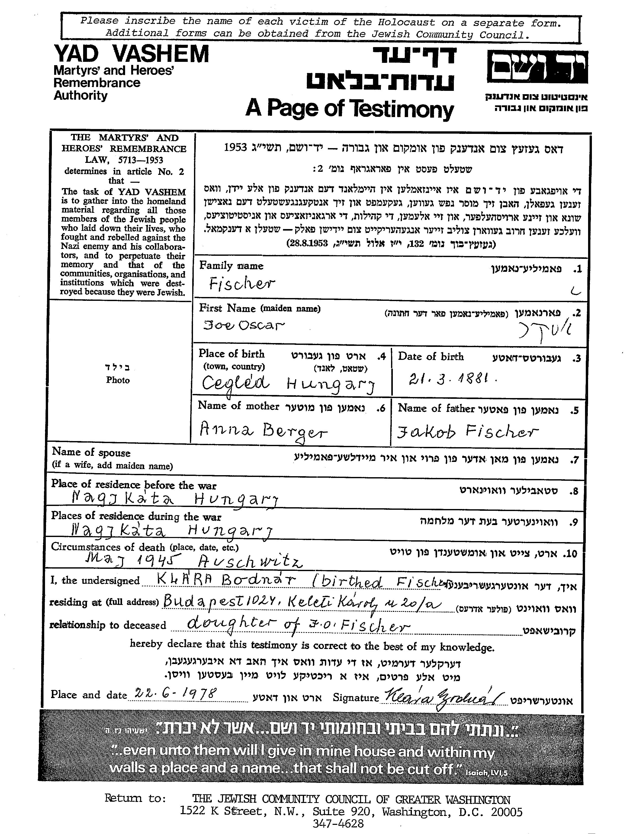 József Oscar Halevy Fischer wurde im Jahr 1881 in Cegled, Ungarn geboren. Vor dem Zweiten Weltkrieg lebte er in Nagykata, Ungarn.