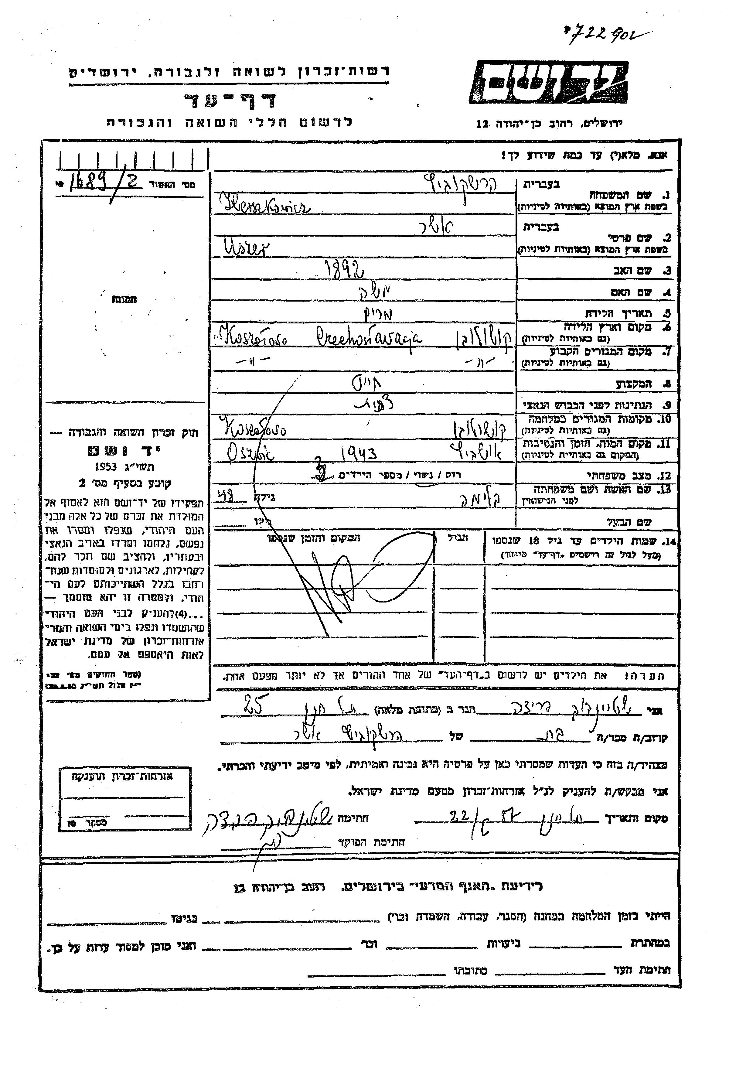 Hershkovitz | Asher | 1890 | Koszolovo, Tschechoslowakei | Gedenkblatt |