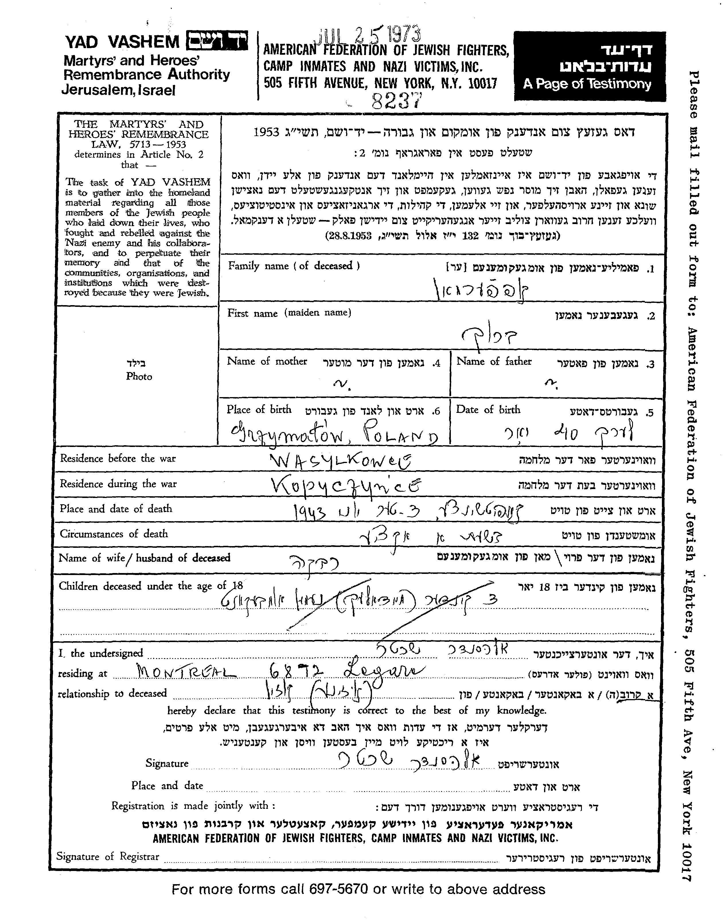 Kuperman Barukh Wasylkowce, Polen Gedenkblatt