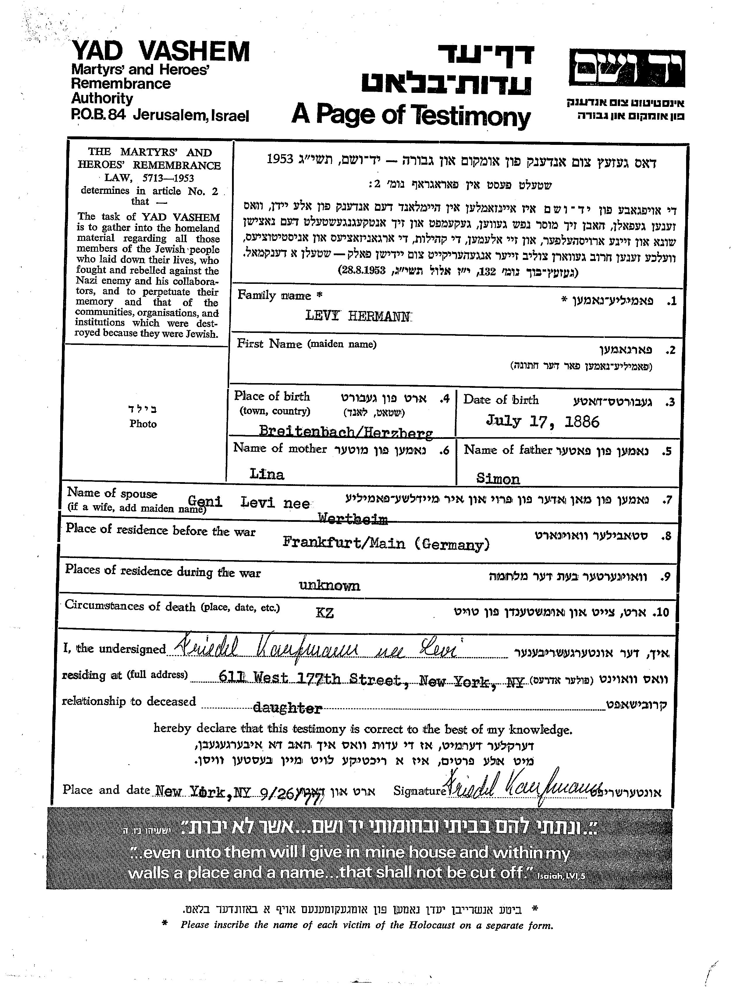 Hermann Levi wurde im Jahr 1886 in Breitenbach am Herzberg, Deutsches Reich geboren. Vor dem Zweiten Weltkrieg lebte er in Frankfurt am Main, Deutsches Reich.