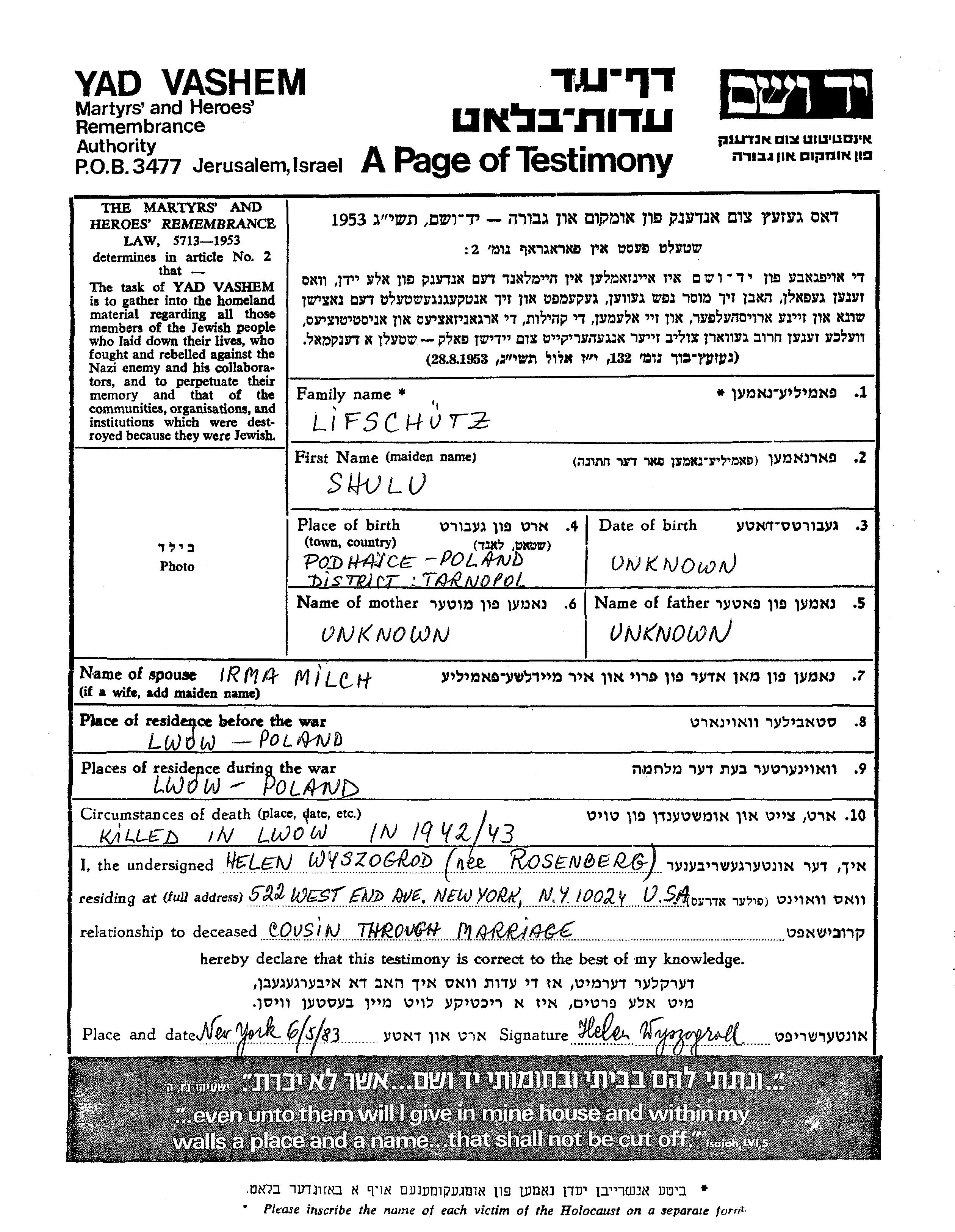 Shulu wurde in der Schoah ermordet. Todesort: Lwow, Polen im Jahr 1942.