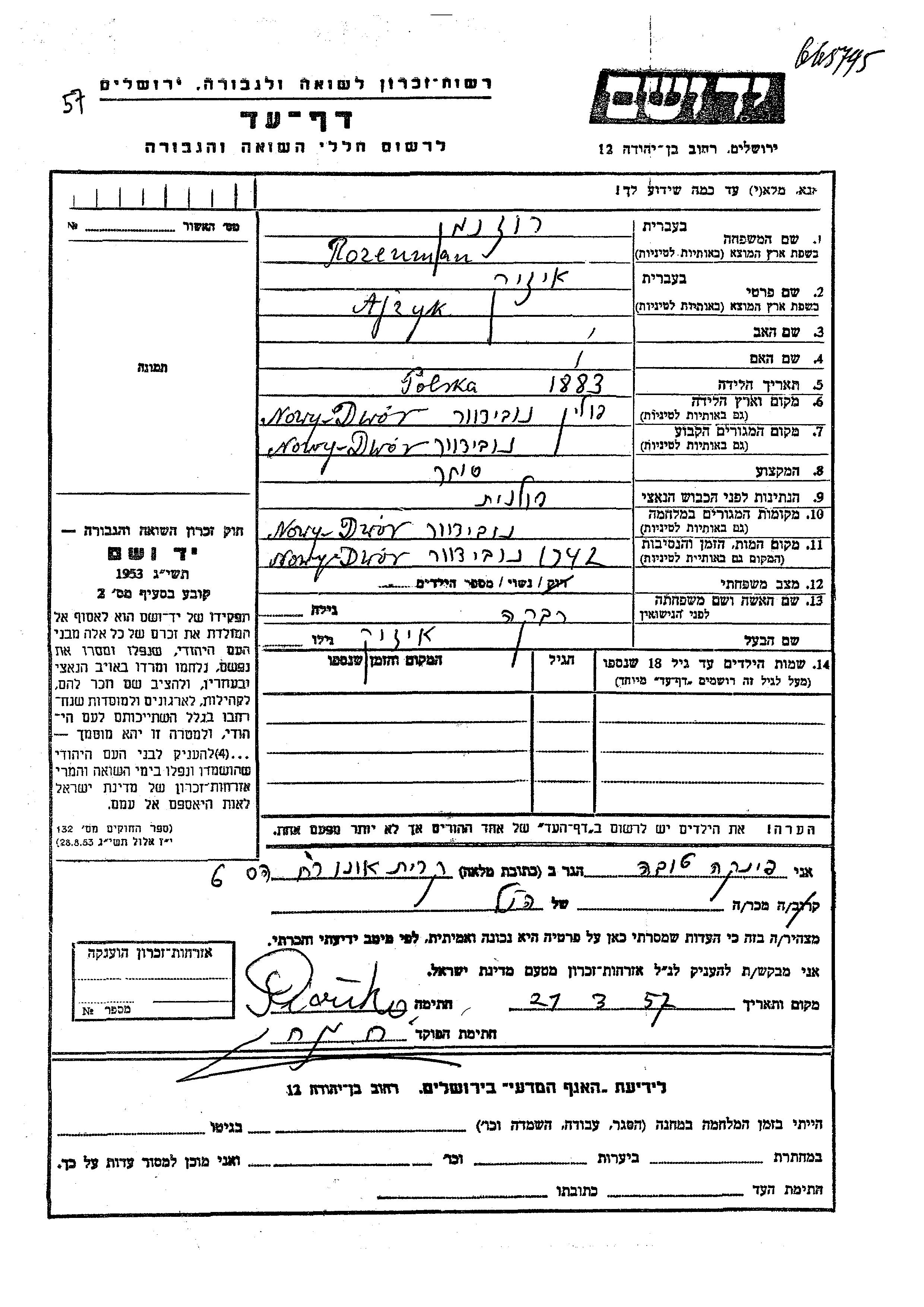 Ajzyk Rozenman wurde im Jahr 1883 in Nowy Dwor, Polen geboren. Vor dem Zweiten Weltkrieg lebte er in Nowy Dwor, Polen.