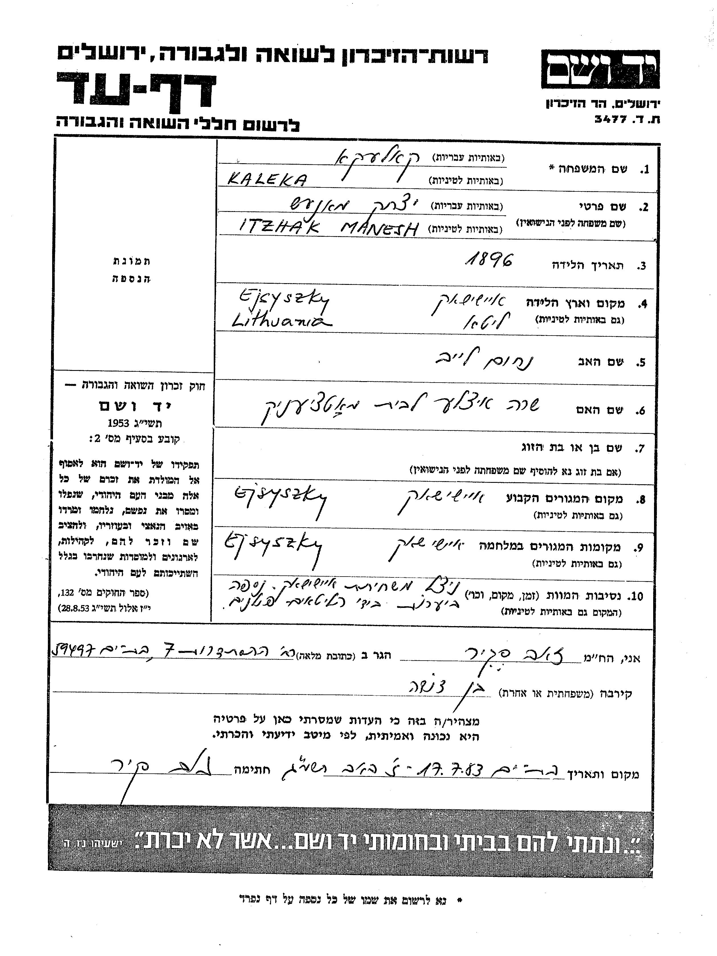 Kaleka | Itzhak Manesh | 1896 | Ejszczyszki, Polen | Gedenkblatt |
