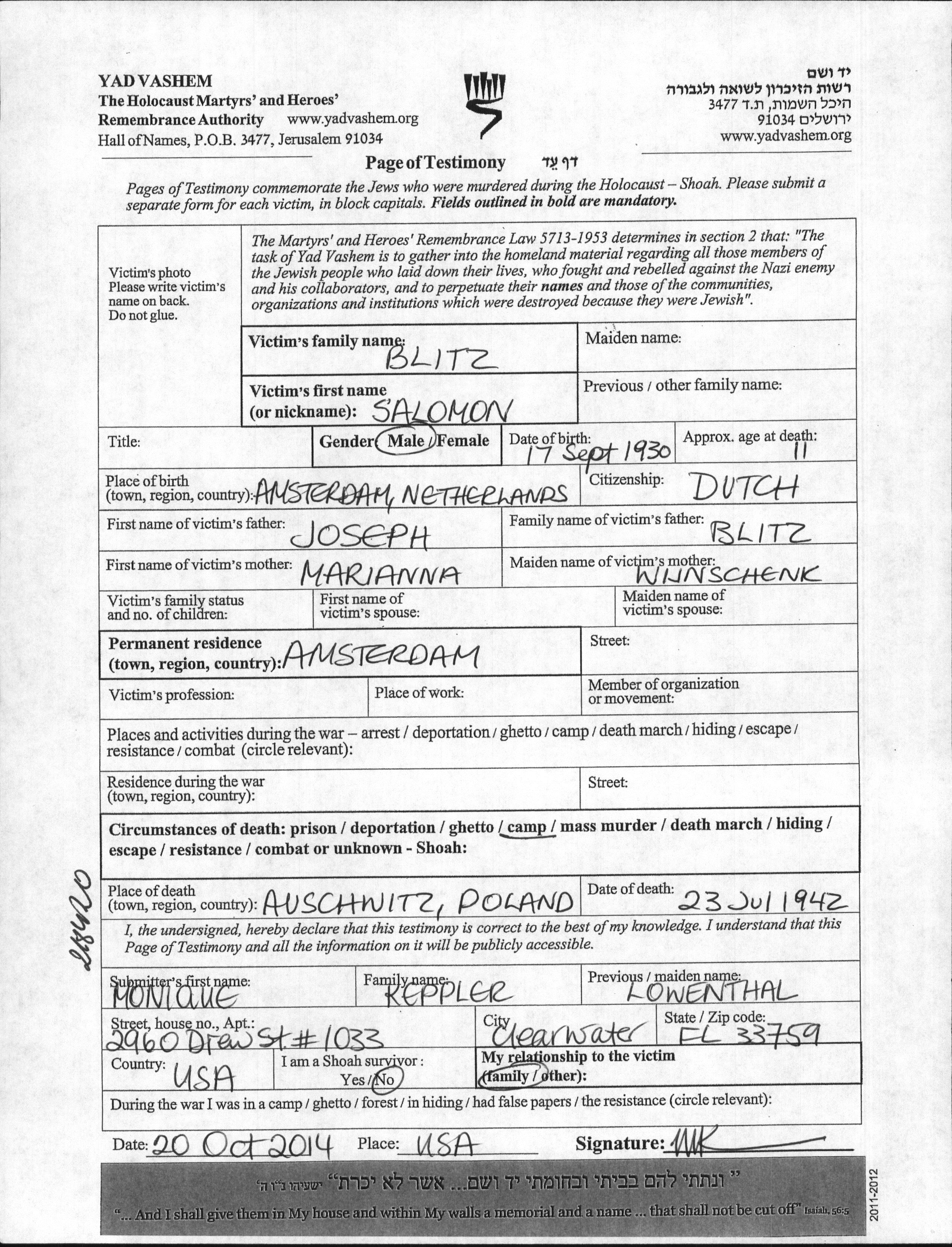 Salomon Blitz wurde im Jahr 1930 in Amsterdam, Niederlande geboren. Vor dem Zweiten Weltkrieg lebte er in Amsterdam, Niederlande.
