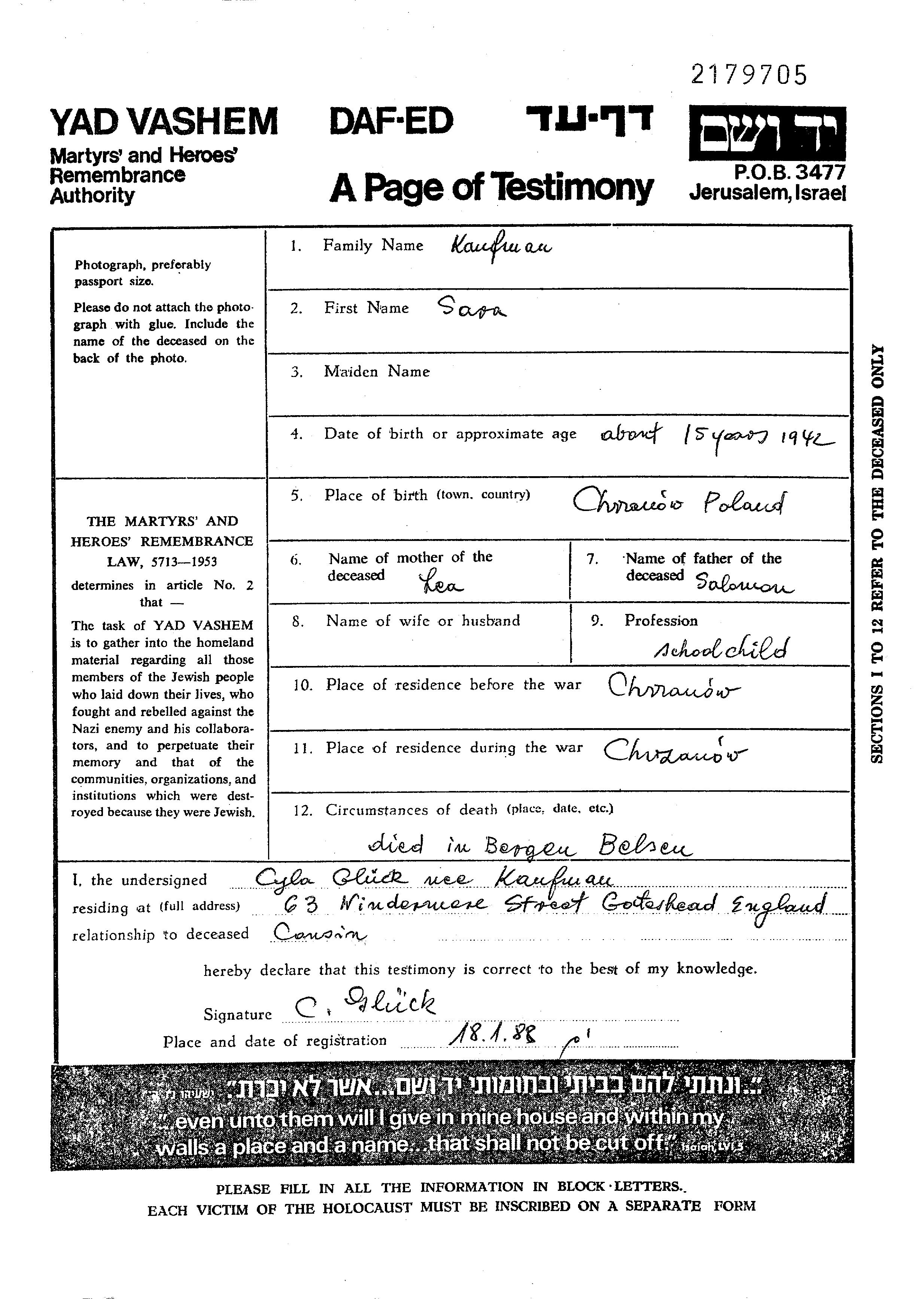 Kaufman Sara 1927 Chrzanow, Polen Gedenkblatt