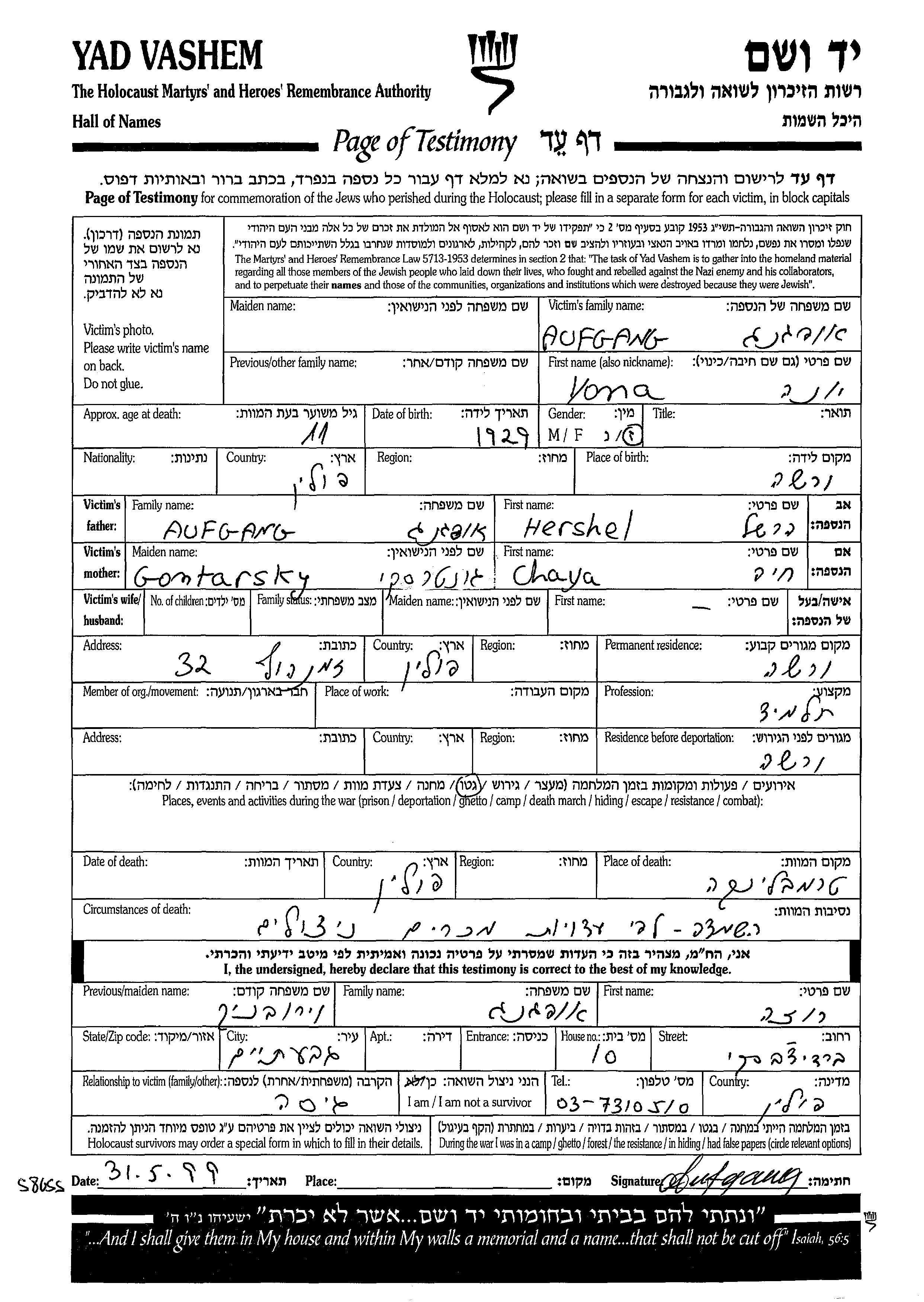 Yona Aufgang wurde im Jahr 1929 in Warsaw, Polen geboren. Er war Schüler/-in. Vor dem Zweiten Weltkrieg lebte er in Warszawa, Polen.