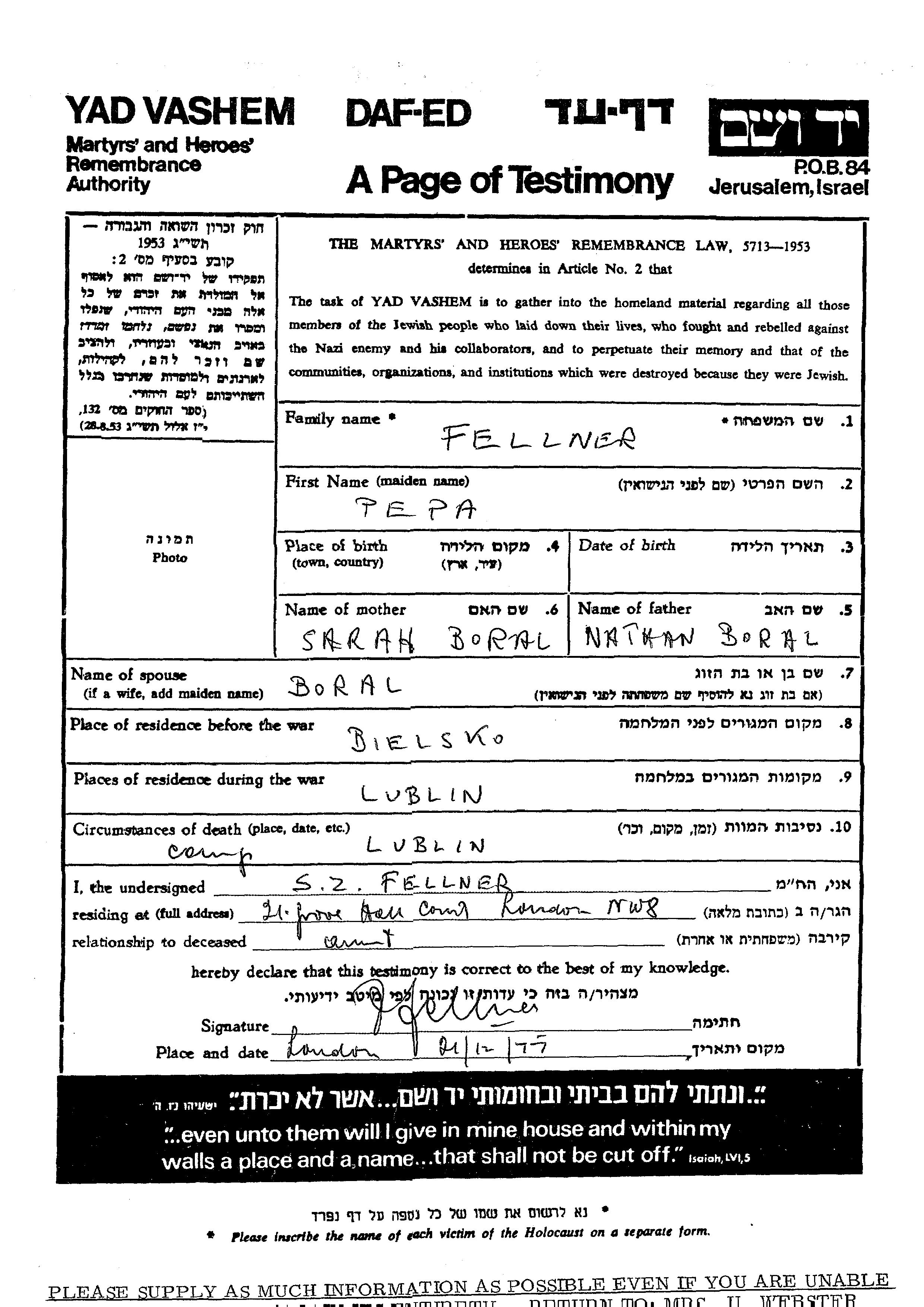 Pepka Fellner, geb. Boral Boreal wurde in Buczacz, Polen geboren. Sie war Hausfrau. Vor dem Zweiten Weltkrieg lebte sie in Bielsko, Polen.