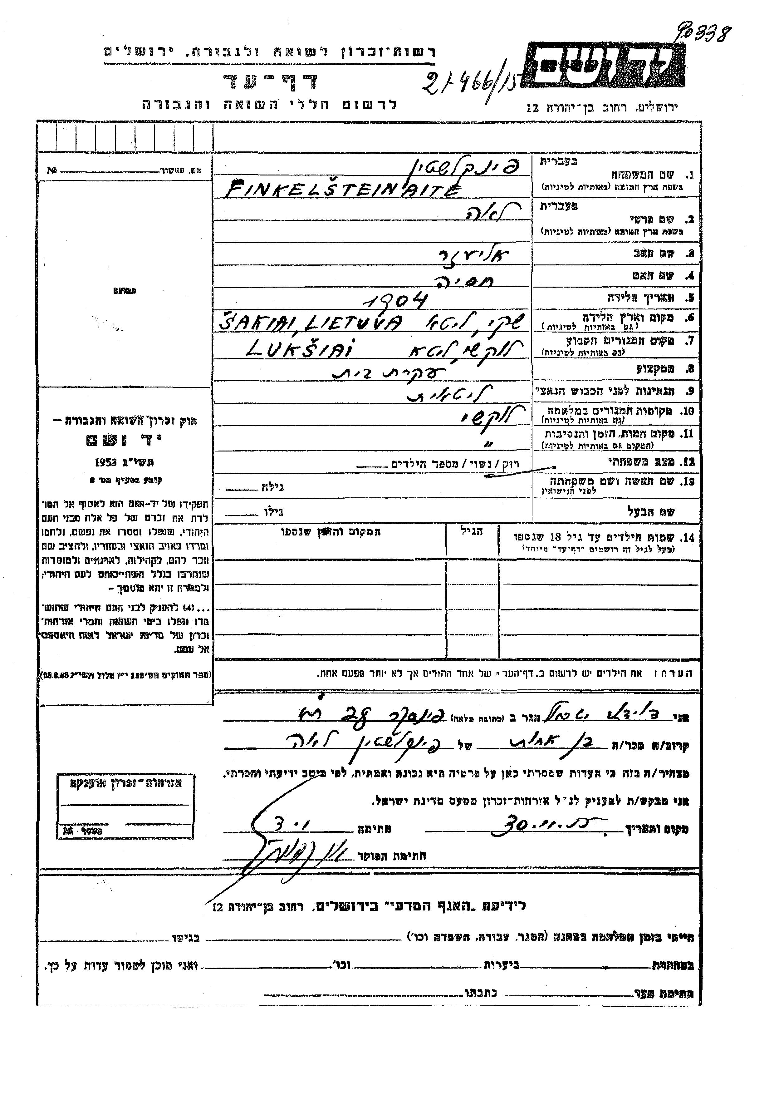 Lea Finkelsteinaite wurde im Jahr 1904 in Sakiai, Litauen geboren. Sie war die Tochter von Eliezer und Khasia. Sie war Hausfrau und Ledig. Vor dem Zweiten Weltkrieg lebte sie in Luksiai, Litauen. Während des Krieges war sie in Luksiai, Litauen.