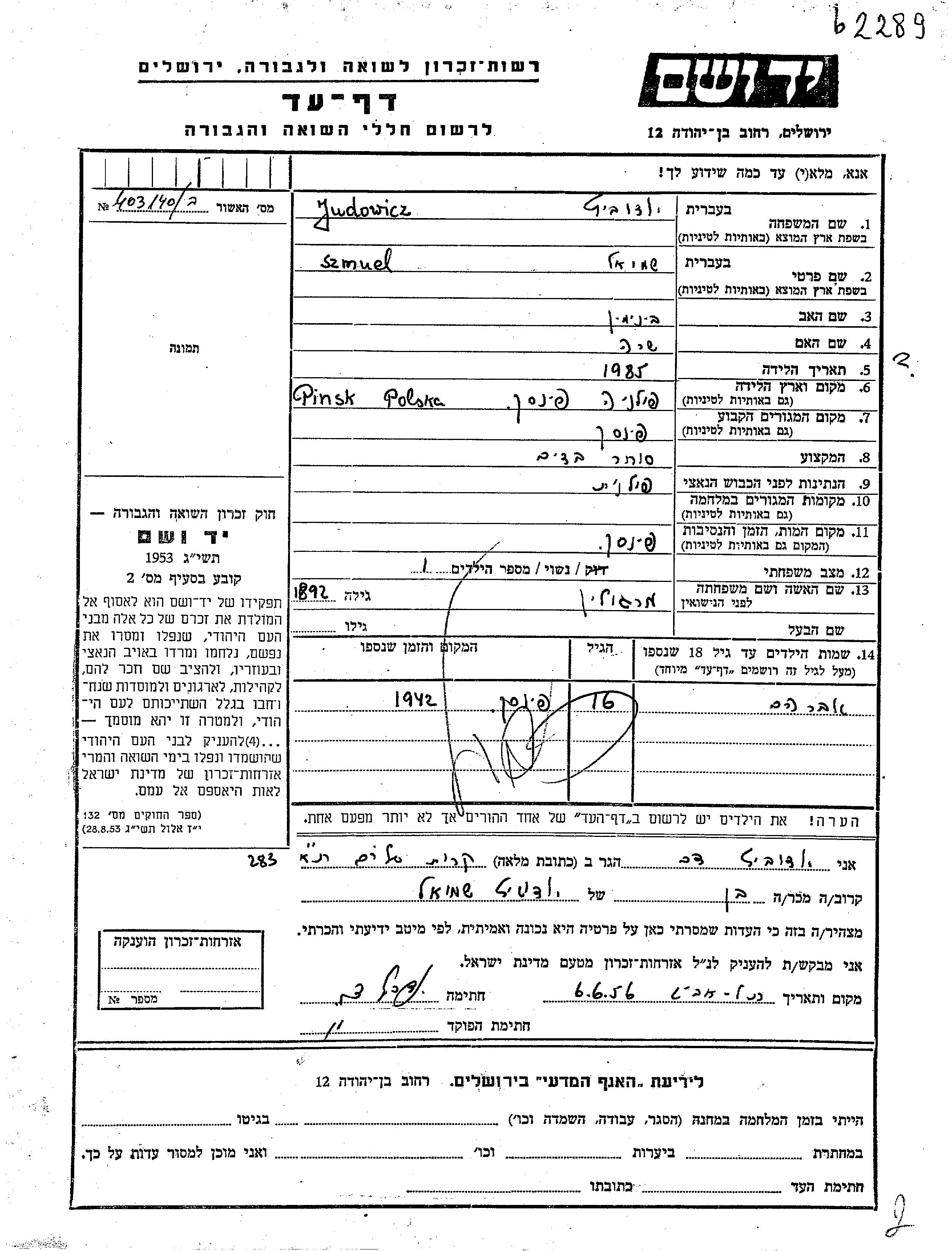 Yudovich Shmuel 1885 Pinsk, Polen Verfolgtenliste