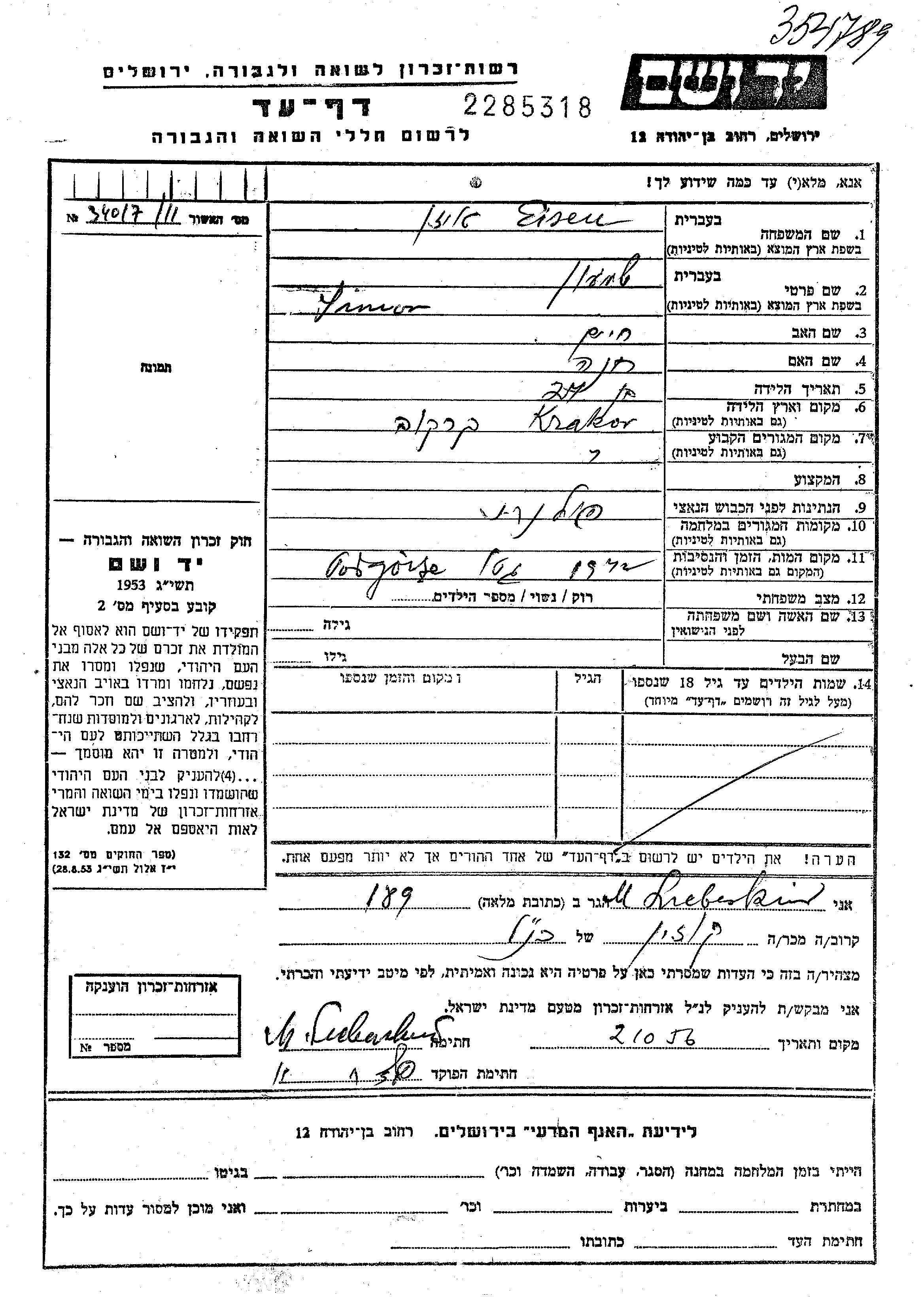 Simon Eizen wurde im Jahr 1910 in Krakow, Polen geboren. Er war Angestellte/-r. Vor dem Zweiten Weltkrieg lebte er in Krakow, Polen.