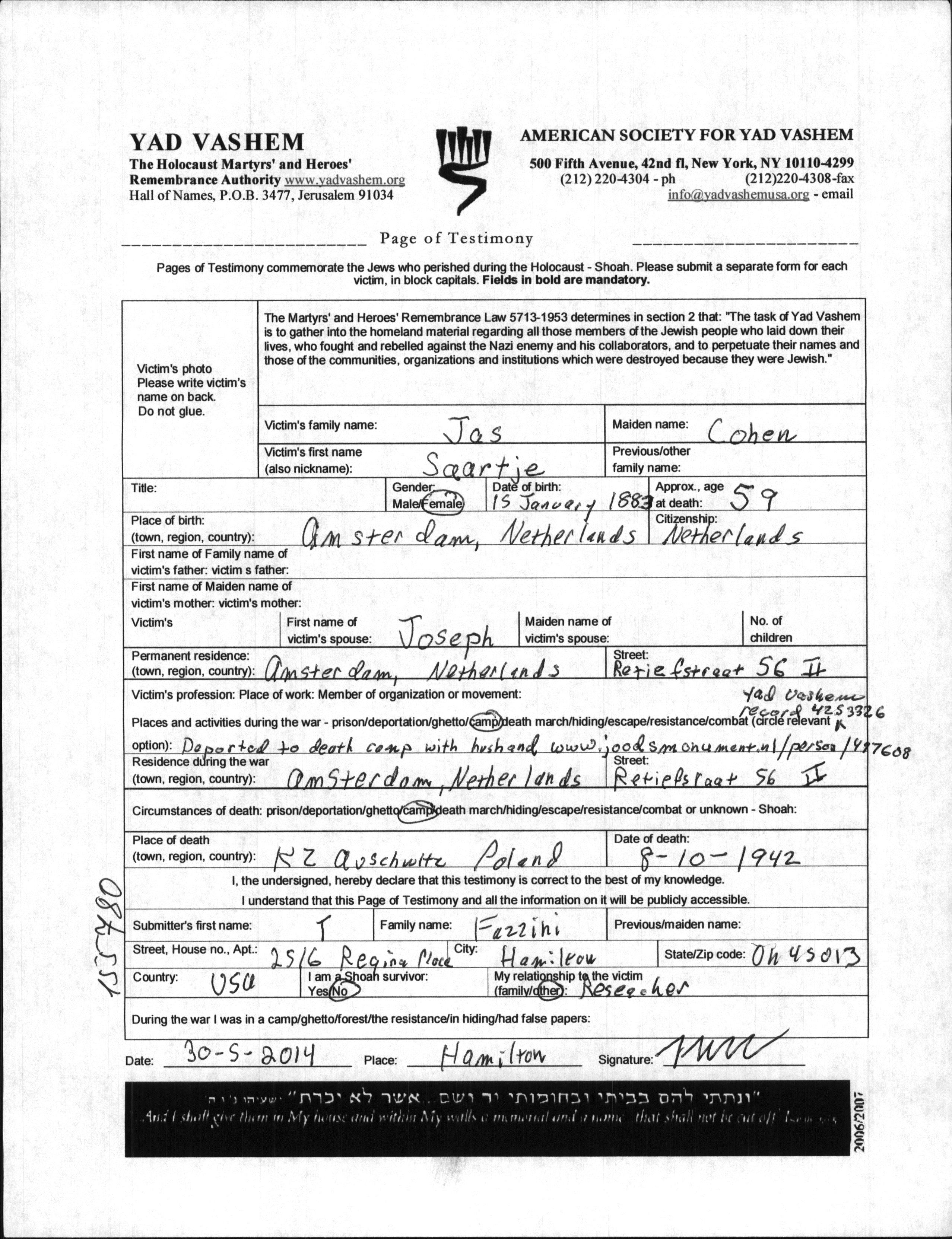 Saartje Jas, geb. Cohen wurde im Jahr 1883 in Amsterdam, Niederlande geboren. Vor dem Zweiten Weltkrieg lebte sie in Amsterdam, Niederlande. Saartje wurde in der Schoah ermordet. Todesort: Auschwitz, Polen im Jahr 1942.